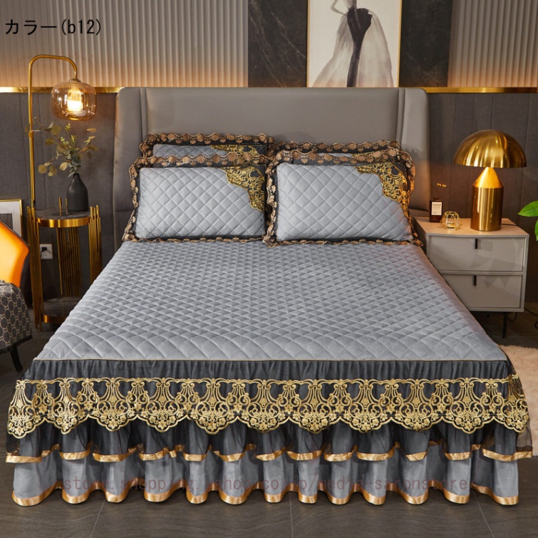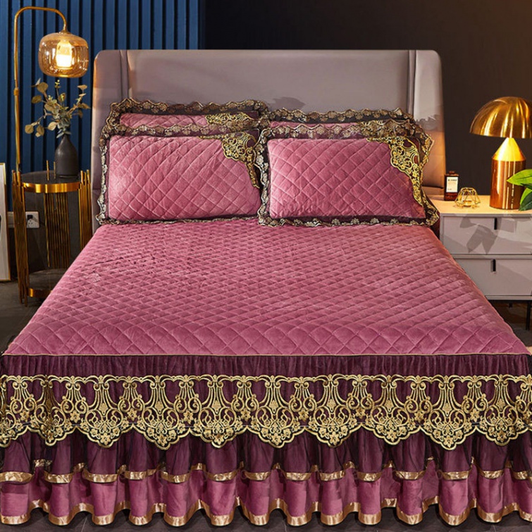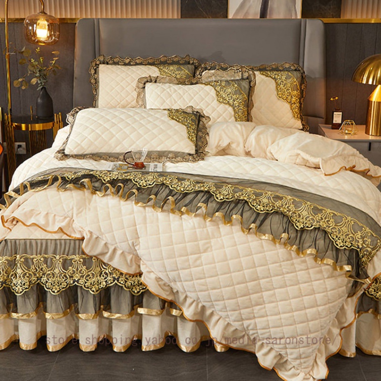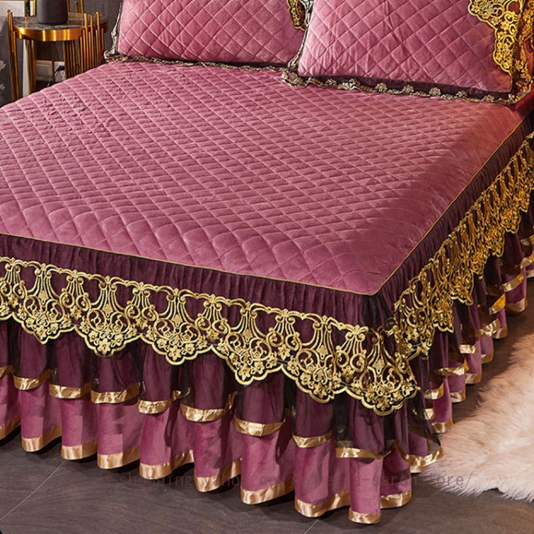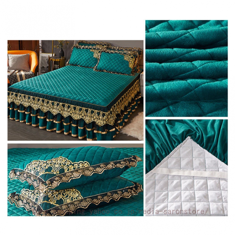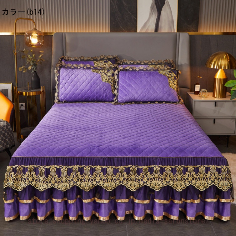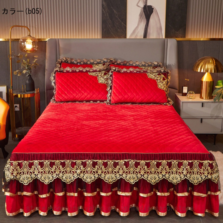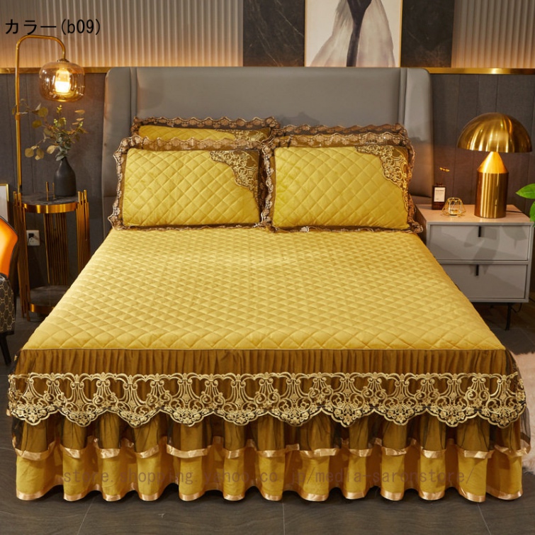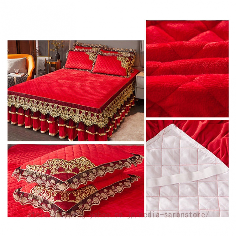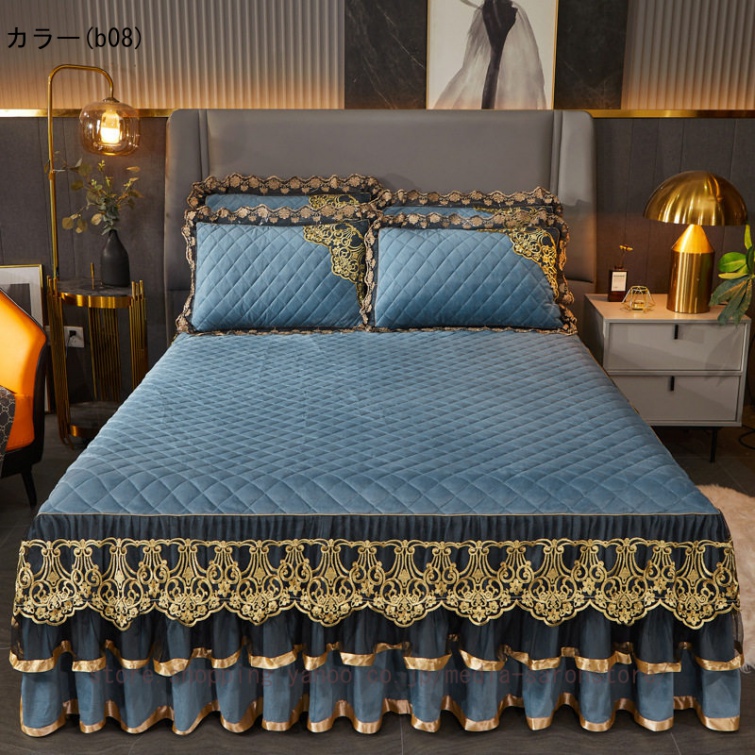 ベッドスカート 2点枕カバー 上品 フランネル キルティング 中綿 厚め ベッドカバー 秋冬 暖かい レース フリル 姫系 柔らか ダブル マットレスカバー