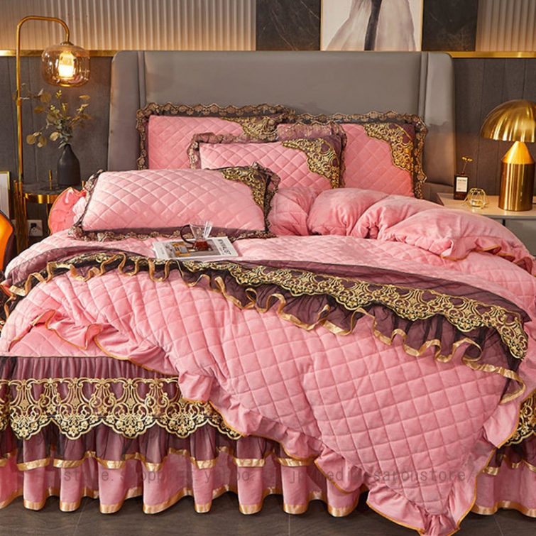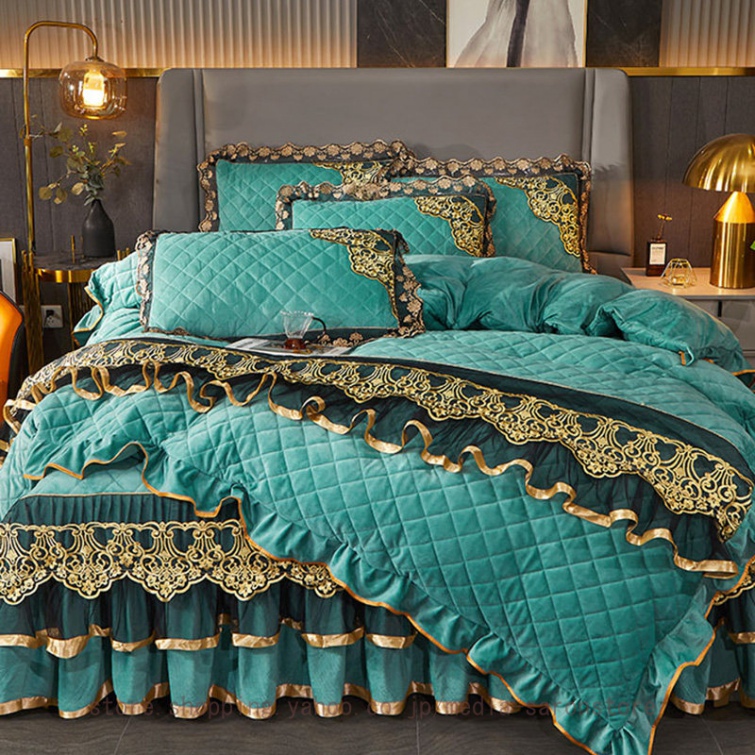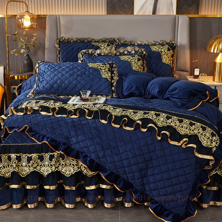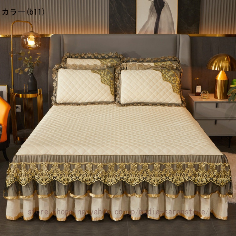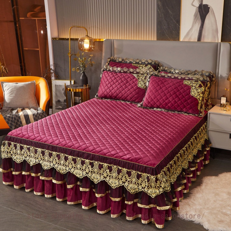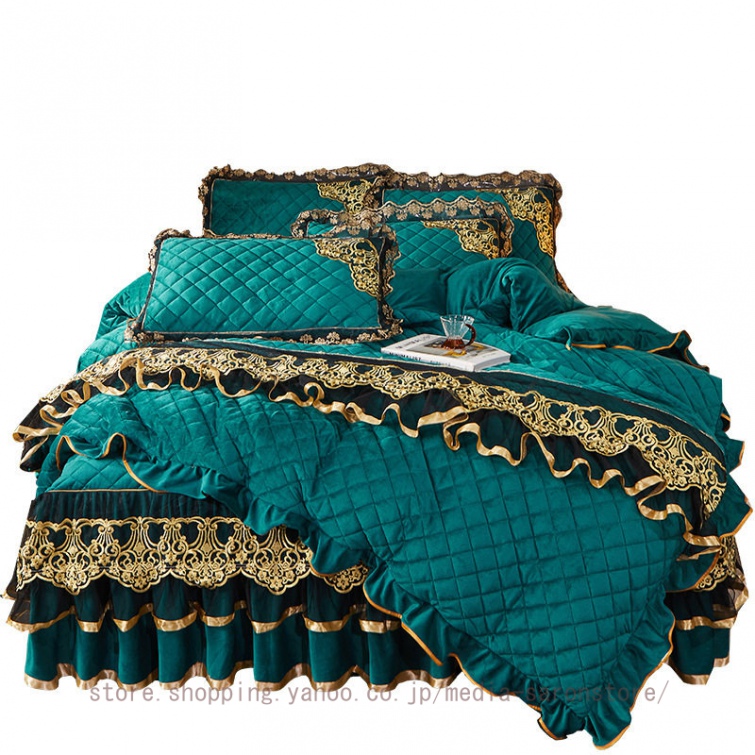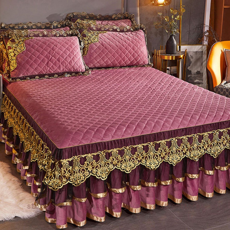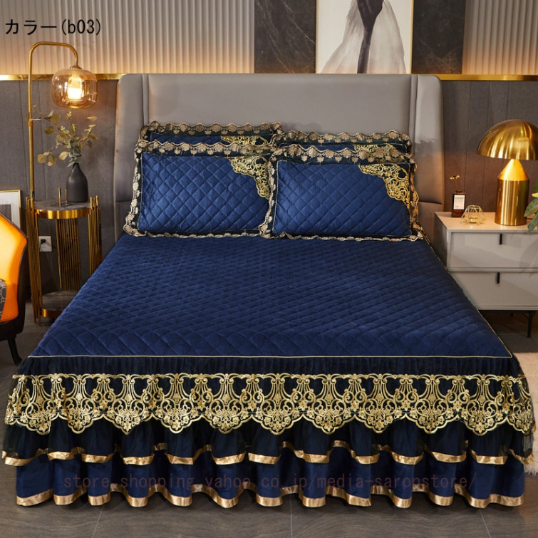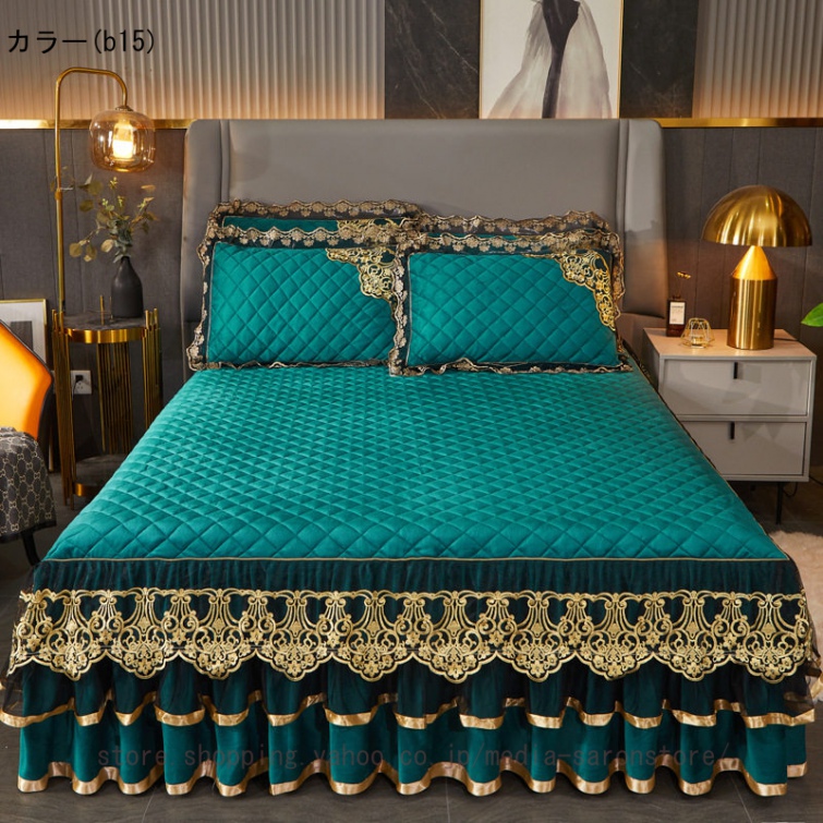ベッドスカート 2点枕カバー 上品 フランネル キルティング 中綿 厚め ベッドカバー 秋冬 暖かい レース フリル 姫系 柔らか ダブル マットレスカバー