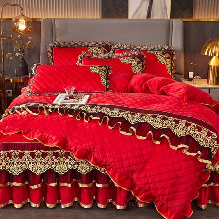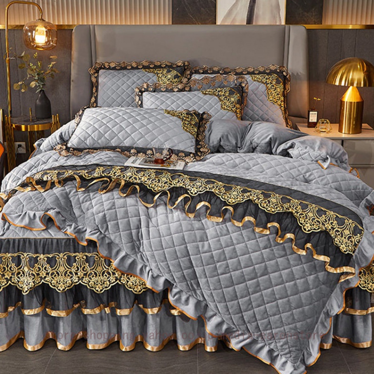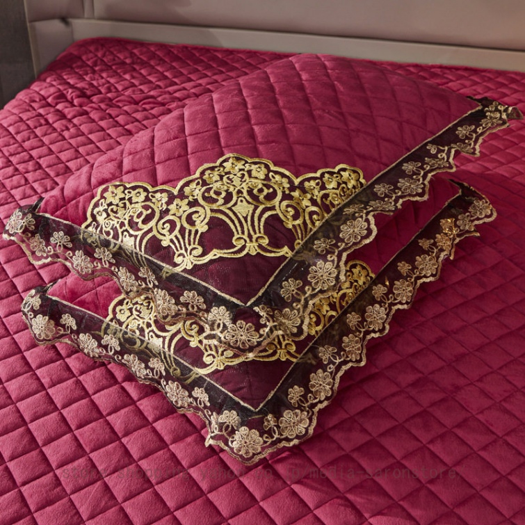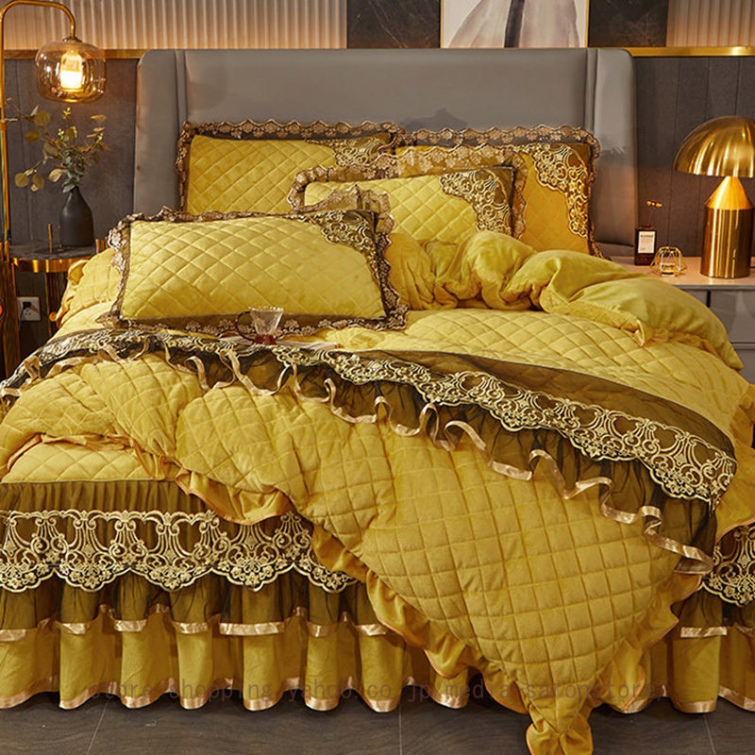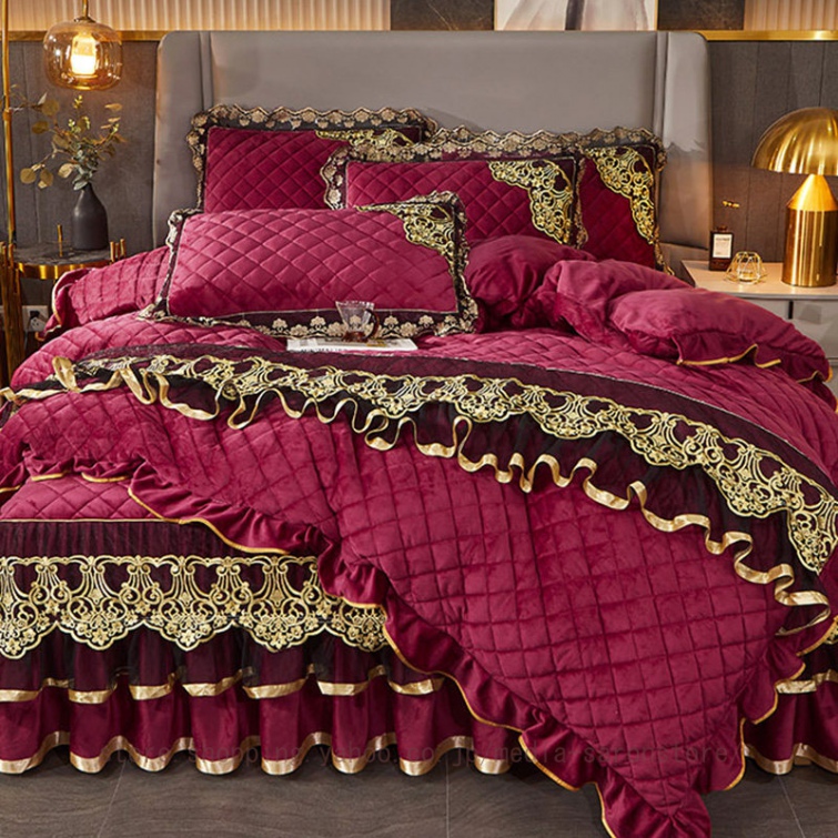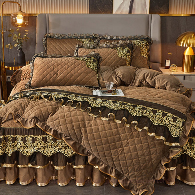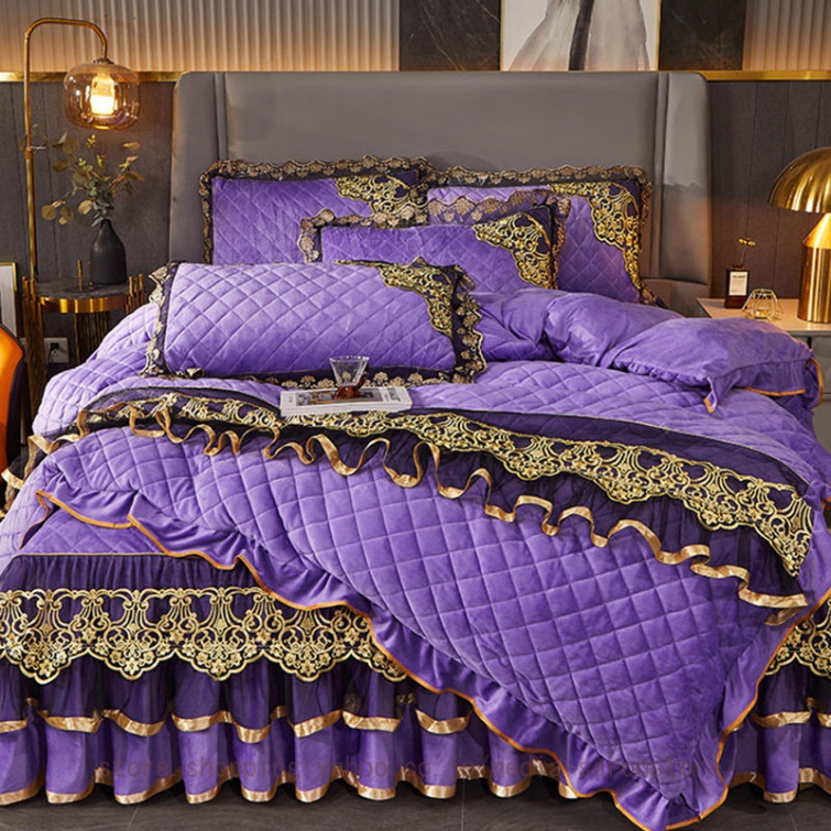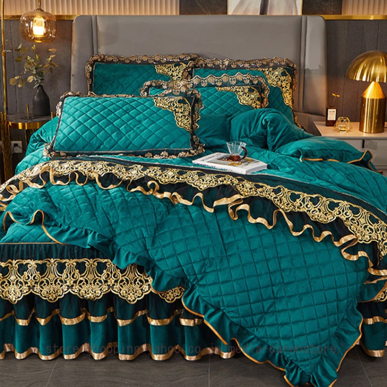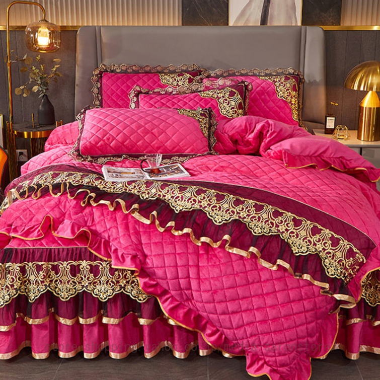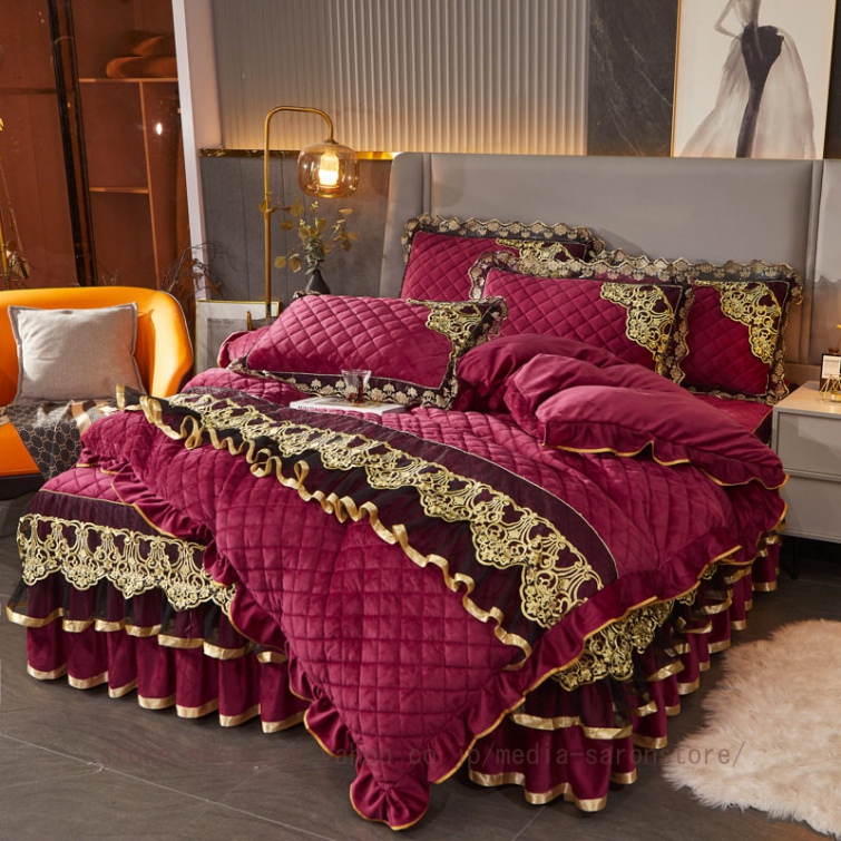 ベッドスカート 2点枕カバー 上品 フランネル キルティング 中綿 厚め ベッドカバー 秋冬 暖かい レース フリル 姫系 柔らか ダブル マットレスカバー