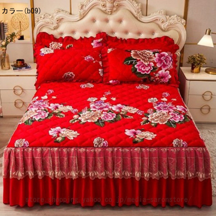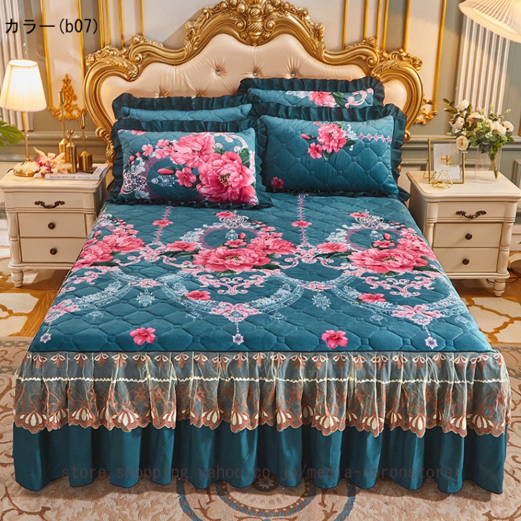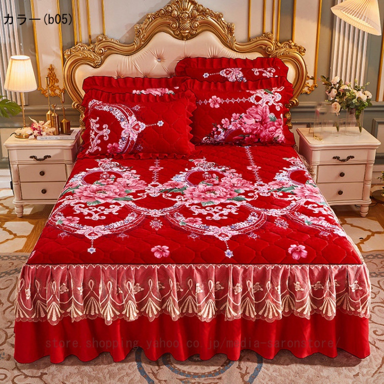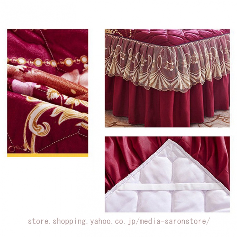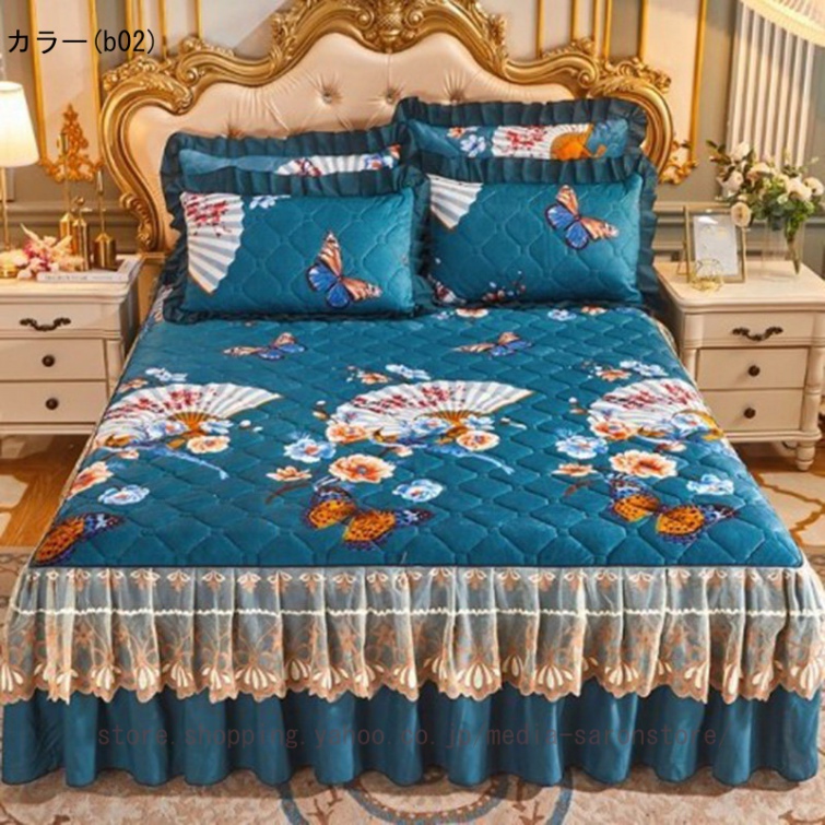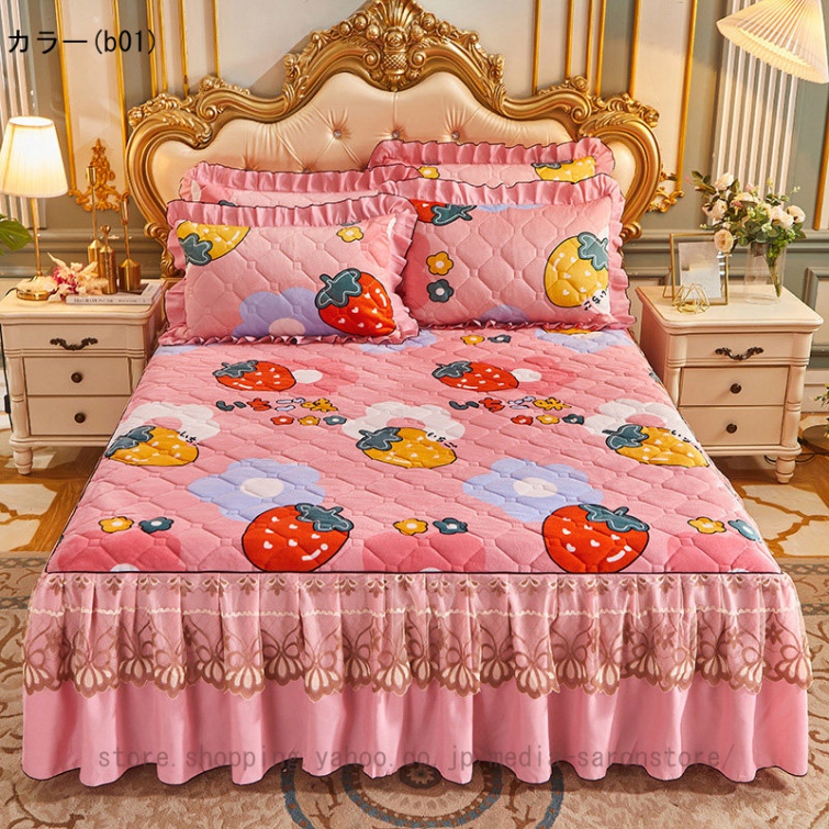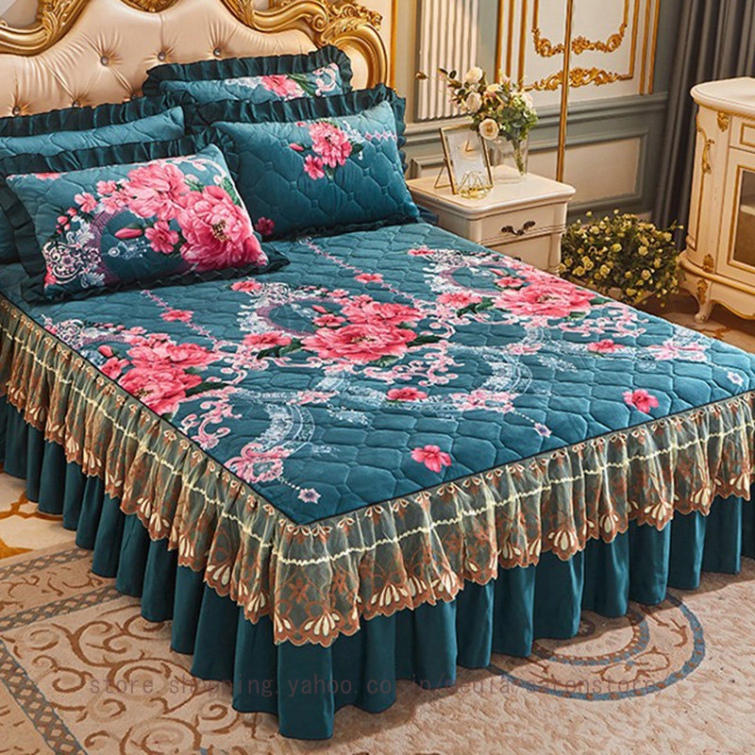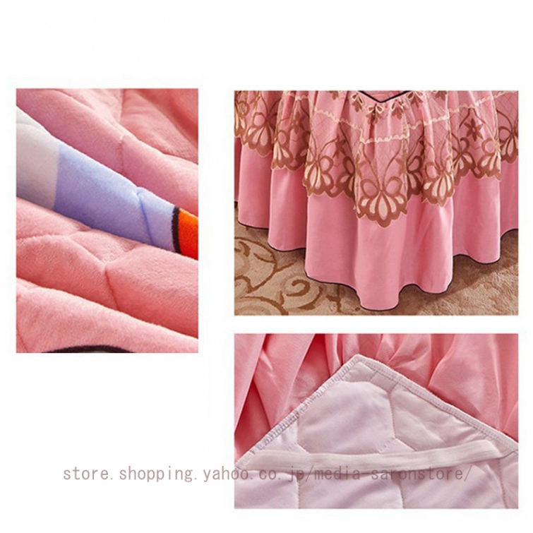 ベッドスカート 2点枕カバー フランネル キルティング 中綿 上品 厚め 姫系 レース ベッドカバー 秋冬 暖かい レース フリル 柔らか ダブル マットレスカバー