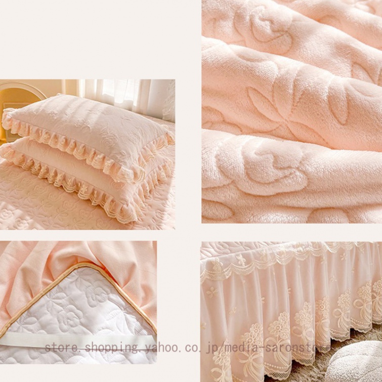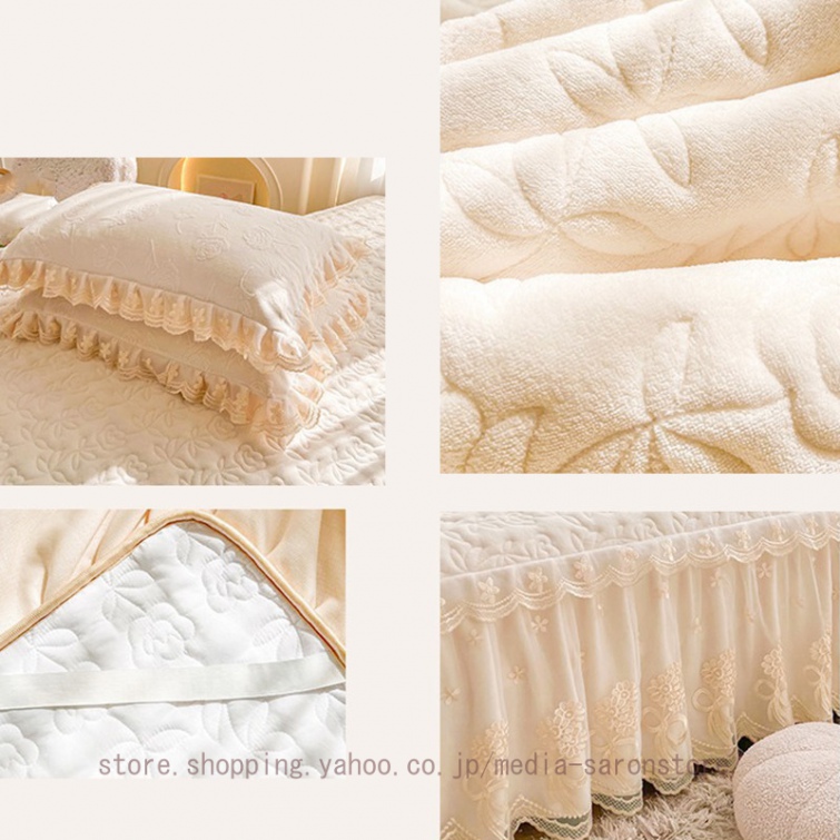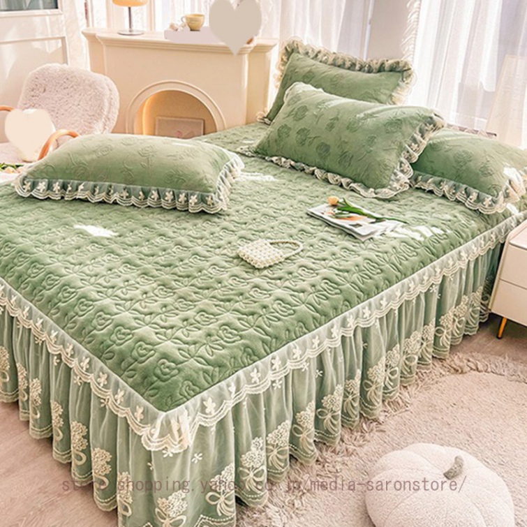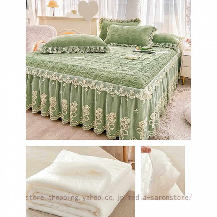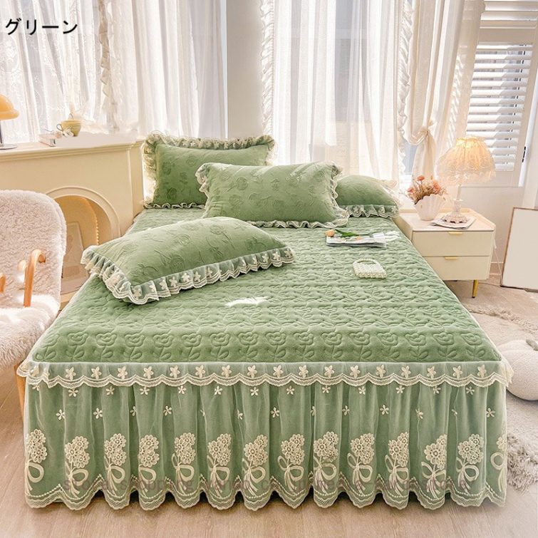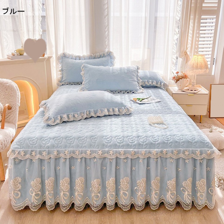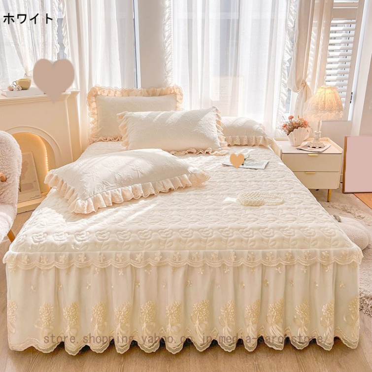ベッドスカート 綿 キルティング マットレスカバー 枕カバーセット フリル付き 敷パッド一体型 中綿 姫系 ズレ防止 オールシーズン 春 秋 冬 洗える