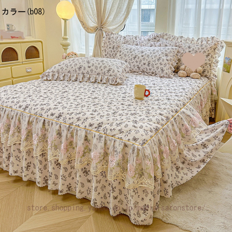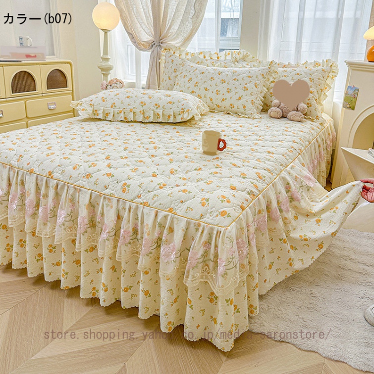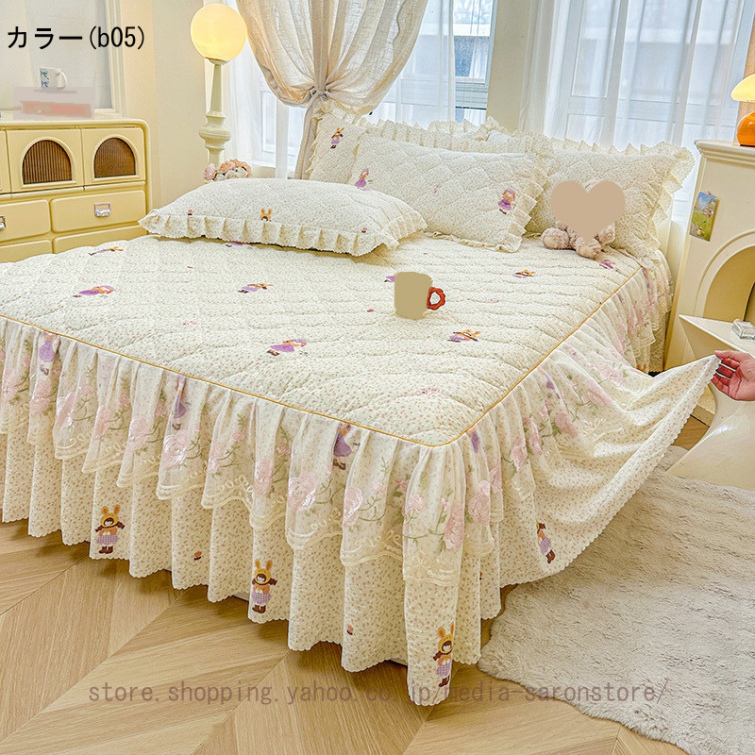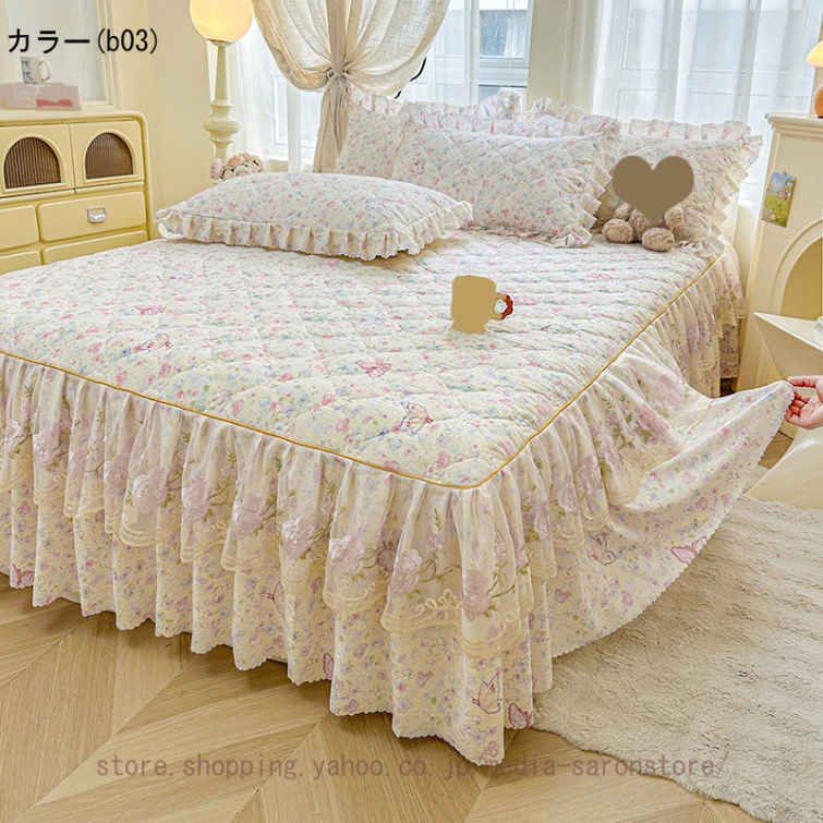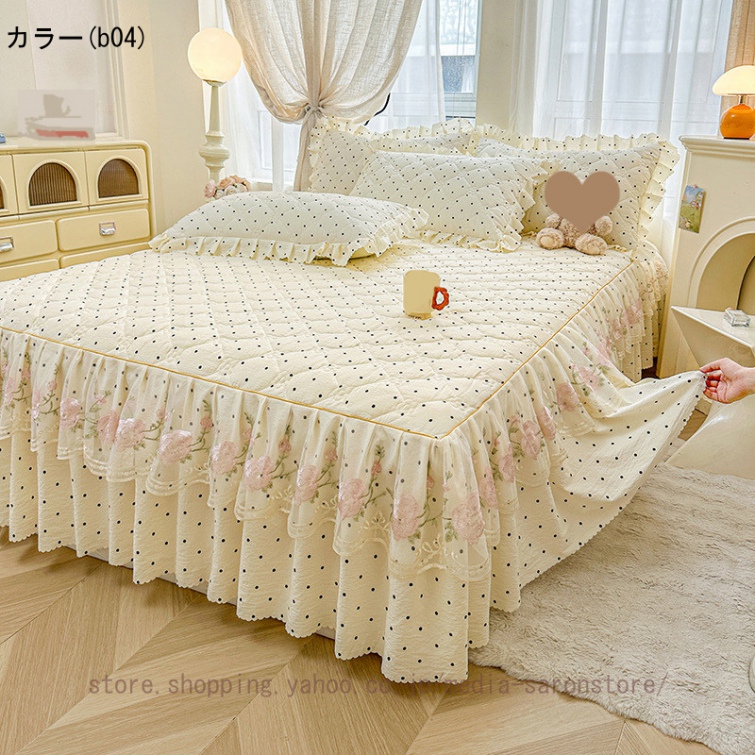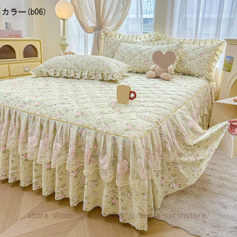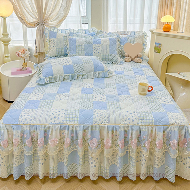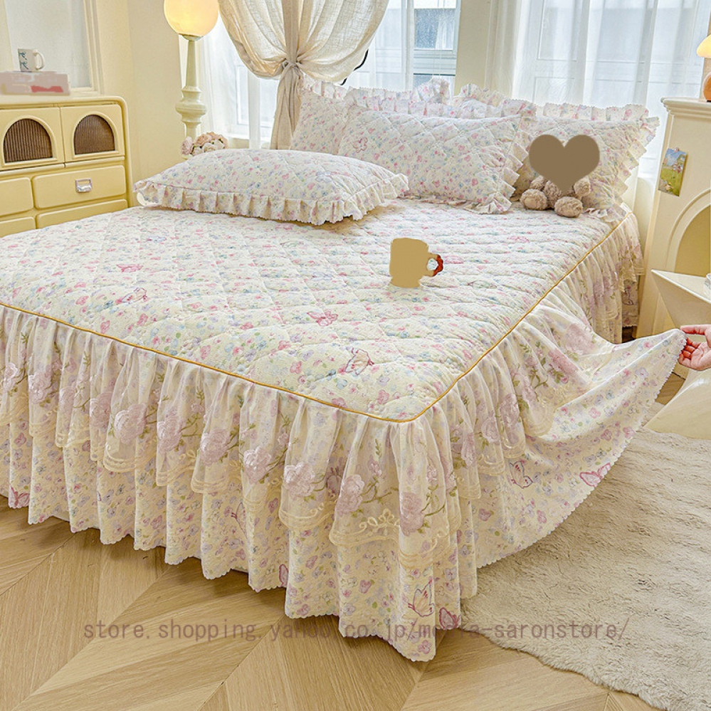 ベッドスカート 枕カバー 3点セット 中綿 厚手 上品 フリル 綿 コットン洗いざらし 柔らかい レース付き シングル ダブル セミダブル キング ベッドカバー