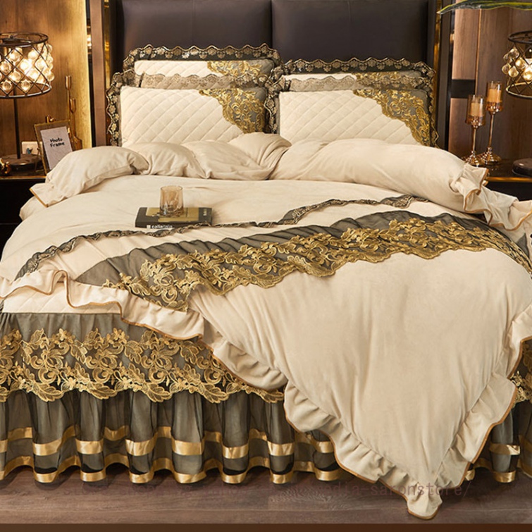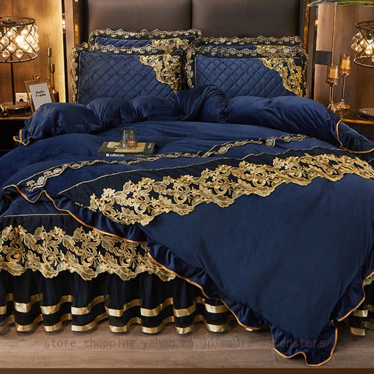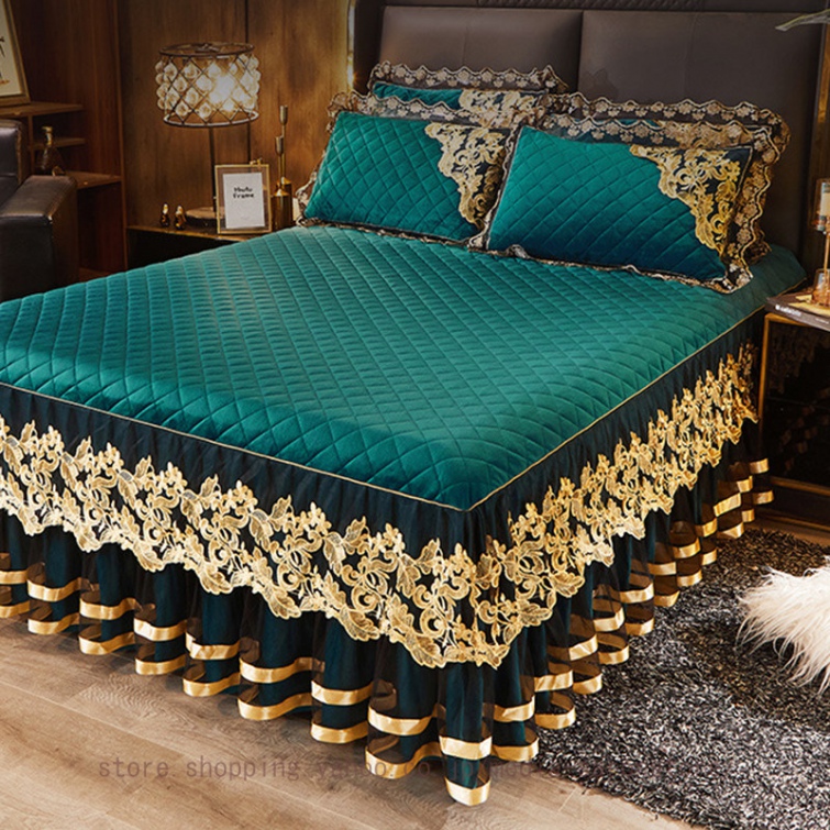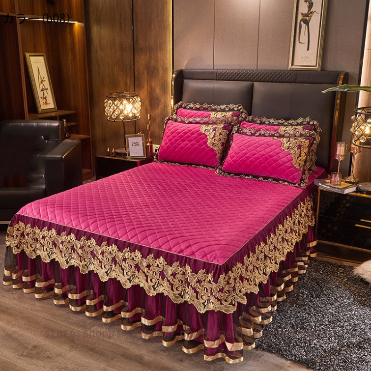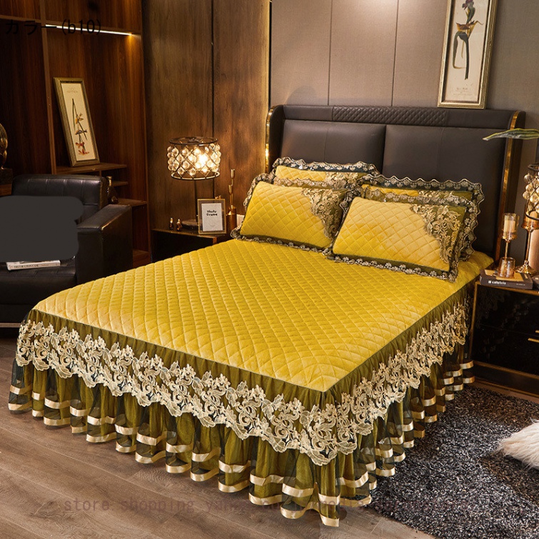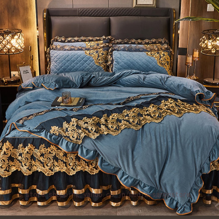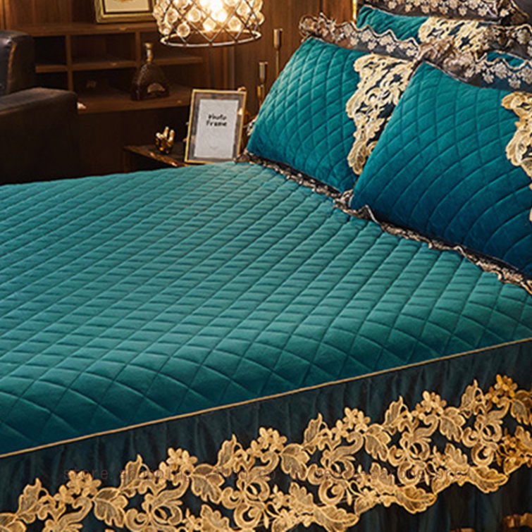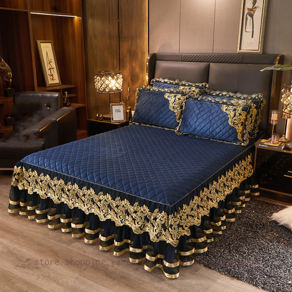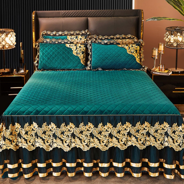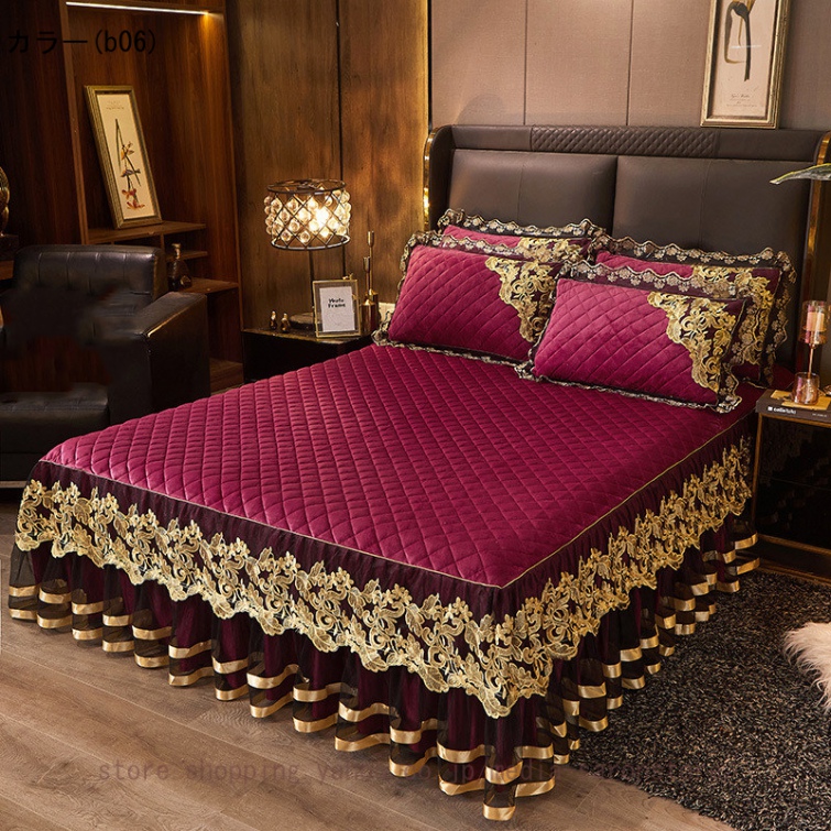 ベッドスカート 刺繍 レース タイプ キルティング 中綿 上品 厚手 姫系 フリル ベッドカバー 秋冬 柔らか ダブル キング ベッドスプレッド マットレスカバー