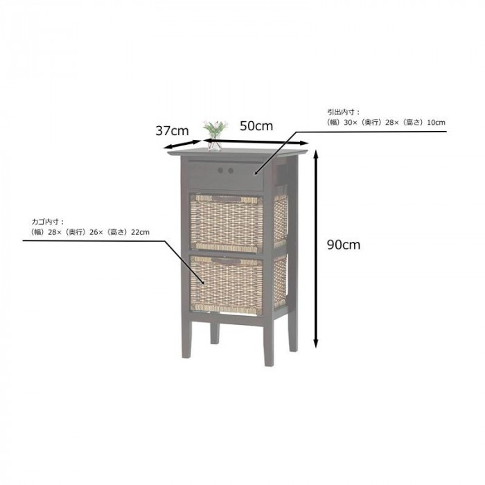 | サイズ | 外寸:(幅)50×(奥行)37×(高)90cm、引出内寸:(幅)30×(奥行)28×(高)10cm(約)、バスケット内寸:(幅)28×(奥行)26×(高)22cm(約)個装サイズ:55×42×95cm |