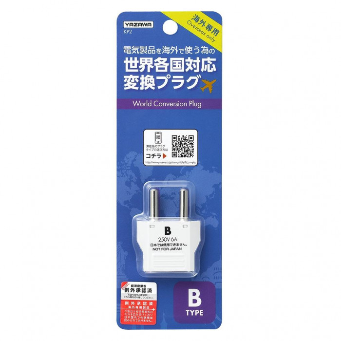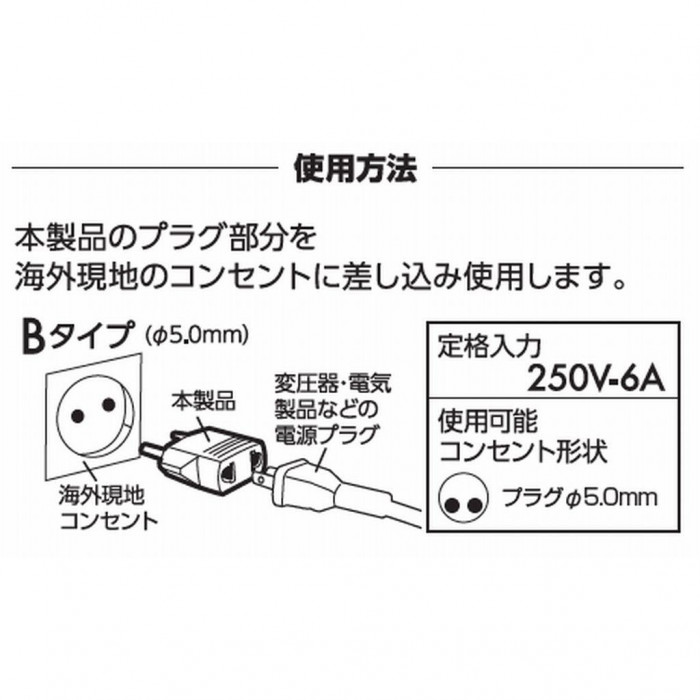 | 電気製品や変圧器のプラグ形状を海外のコンセントに合わせたい時に使用します。 【主なBプラグ使用国】 オランダ・中国・ミャンマー・モンゴル、インドなど ※本品は日本の電気製品を海外で使う為のプラグアダプターです。 ※日本国内にて本品を使用する事はできません。 ※本品は電圧の変換はできません。電圧の変換が必要な場合は別途変圧器が必要です。 ※同じ国の中でも地域により異なる場合があります。事前に旅行会社、ホテルなどにお問い合わせください。 |