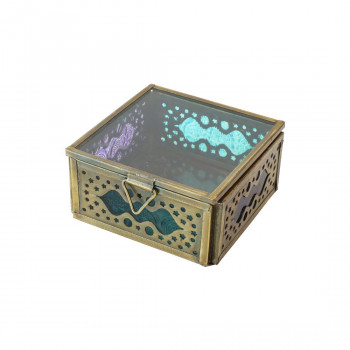 上品な透け感のパープルとターコイズのレリーフガラスをはめ込んだ美しいボックスです。ゴールドで縁取られたアンティーク風なデザインは、小物やアクセサリーを入れるだけでなくディスプレイ効果も。置いているだけで気分が上がるオリエンタルなインテリアアイテムです。