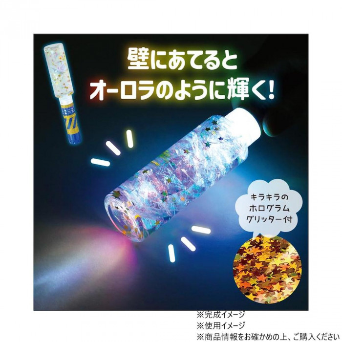 | 幻想的な光が輝くライト付き。スティックの中でオーロラフィルムと星形のホログラムグリッターが舞って明るいところでも暗いところでもきれいに見えます。暗いところでライトを点灯し、壁にあてるとオーロラのような光を投影させることができます。 ※ライトの柄、デコレ―ションテープの色は取り混ぜです。 |