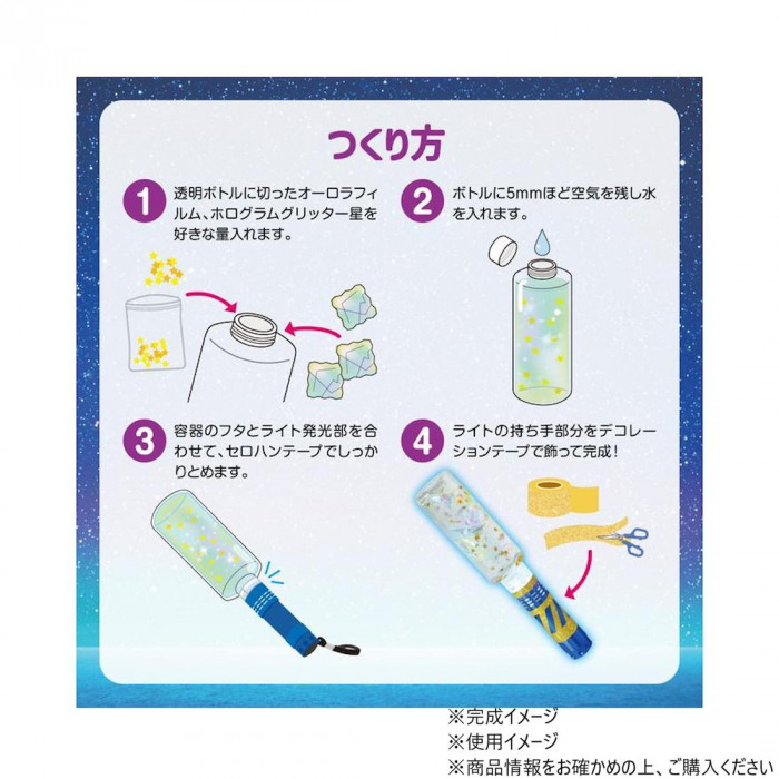 | セット内容 | 透明プラスチックボトル×1、ライト(色取り混ぜ)×1、ホログラムグリッター星×1、デコレーションテープ(色・柄取り混ぜ)×1、オーロラフィルム×1 |