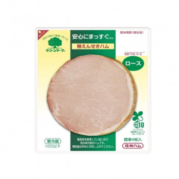 | 原材料 | 名称:無えんせきハム(スライス) 豚ロース肉(輸入)、乳たん白、糖類(粉末水あめ、砂糖)、食塩、たん白加水分解物、酵母エキス、植物油脂/卵殻カルシウム、香辛料抽出物、(一部に乳成分・卵・豚肉を含む) |