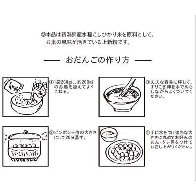 新潟県産水稲こしひかりを100%使用した上新粉です。歯ごたえがあり、米の風味が活きただんごができます。1袋で約30粒のだんごができます。