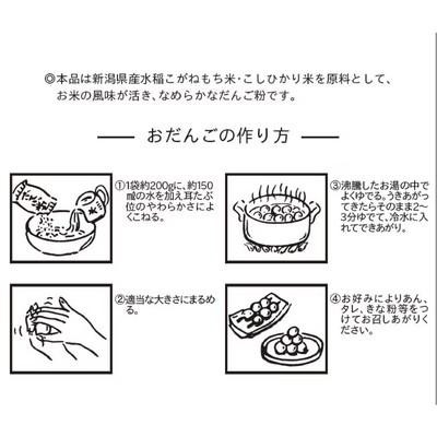 | 新潟県産水稲こがねもち・こしひかりを使用。水でこねて茹でるだけで、やわらかな食感のだんごができます。1袋で約30粒のだんごができます。 |