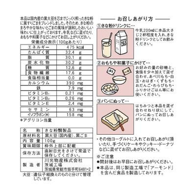 | 国内産黒大豆のきな粉と黒ごまをブレンド、コクと甘味のあるきな粉に仕上げました。 ※大豆:遺伝子組み換えのものと分けて管理しています。 |