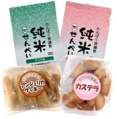 純米せんべい サラダ味、純米せんべい 海老味、ジンゾウ先生のアンジェリカクッキー、ジンゾウ先生のカステラのセットです。間食やエネルギー補給に大活躍なおやつをお得なセットにしました。