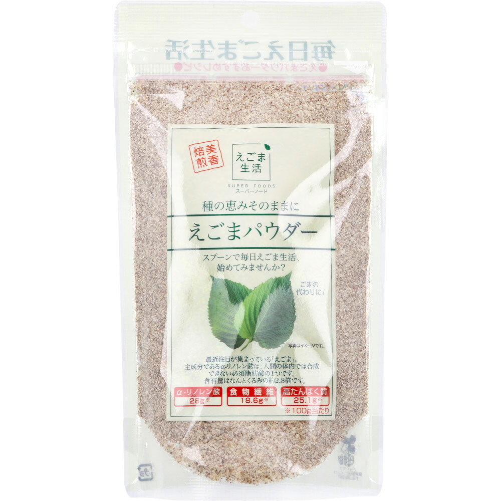 【商品仕様】【名称】えごまパウダー【原材料】えごまパウダー(国内製造)【栄養成分(100g当たり)】エネルギー:575kcaLたんぱく質:25.1g脂質:46.2g炭水化物:23.9g糖質:5.3g食物繊維:18.6g食塩相当量:0gα-リノレン酸:26g【えごまパウダーおすすめレシピ】★シンプルに冷奴・豆腐を水切りし、器に盛り塩・えごまパウダーをかけてかいわれ大根を添えて出来上がり。★きんぴらごぼう・普段のご家庭のきんぴらごぼうに、えごまパウダーをかけて仕上げます。★ほうれん草のえごま和え・茹でてから適当な大きさに切り、水気を切ったほうれんそうに、えごまパウダー、しょうゆ、砂糖を混ぜた物で和えて出来 上がり。★えごまの味噌汁・お好みの具材でお味汁を作り、火を止めてから仕上げにえごまパウダーを振りかければえごまのお味噌汁の出来上がりです。★調味料として!手造りえごまだれ・えごまパウダー、マヨネーズ、しょうゆ、砂糖をお好みの分量で混ぜれば、あっという間に美味しいえごまだれの出来上がり。【保存方法】直射日光、高温・多湿を避けて保存してください。【注意事項】【注意】・本品製造工場では、小麦、卵、乳成分、落花生を含む製品を製造しています。・開封後は酸化しやすいためチャックをしっかり閉じて、冷暗所(夏季(6月から10月)は冷蔵庫)に保管し、賞味期限に関わらずお早めにお使いください。・脂質成分により固まる場合がありますが、品質には問題ありません。ほぐしてから召し上がりください。【メーカ】有限会社味源【生産地】日本