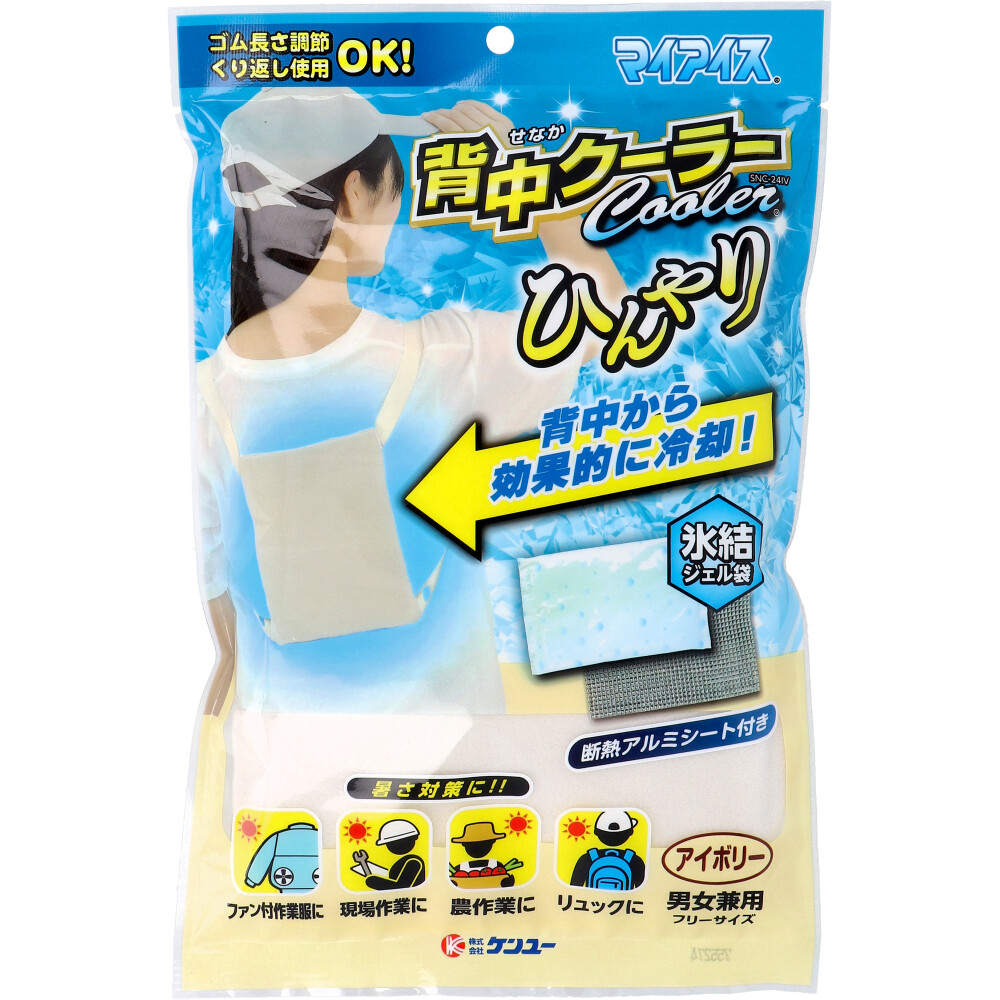 【商品仕様】【成分】 ・ジェル袋(日本製):水 高分子吸水樹脂 ポリエチレン・カバー(中国製):ポリエステル・断熱アルミシート(中国製):ポリエステル (アルミ蒸着)、発泡ポリエチレン【商品サイズ】・本体:W160XH230XD30(mm) (ゴム除く)【重量】・本体:465g【セット内容】カバー1、ジェル袋1、断熱アルミシート 1【使用方法】(1)ジェル袋を冷凍庫で4時間以上冷やす。(カチカチに凍るまで)※重ねず平らにして、いびつな形にならない様注意する。(2)カバーに断熱アルミシートをセットする。(最初はセット済みです)(3)ジェル袋をカバーに入れる。ジェル袋入口を上にして体に装着する。必要に応じてゴムの長さを調節する。【注意事項】・ジェル袋の中身は食べないで下さい。中身を食べた場合は本品とパッケージを持参し、医師に相談して下さい。・必ず衣服の上から装着して下さい。冷たすぎると感じた場合はアルミシートの面を体に当てるか、タオルを巻くなどして調節して下さい。使用中異常を感じた場合は使用を中止し、医師に相談して下さい。・直接ジェル袋を体に当てないで下さい。・ジェル袋の中身が目に入ったり皮ふに付いたりした時は、水で洗い流して下さい。異常を感じた場合は医師に相談して下さい。・循環器系疾患 (高血圧、低血圧、狭心症等)の方は、医師にご相談の上お使い下さい。・冷たすぎる事を自分で判断できない方は使用をしないで下さい。・ジェル袋をいびつな形で凍らせないで下さい。破損の恐れがあります。・強い衝撃を与えたり、尖った物に接触させないで下さい。特に凍結したジェル袋に衝撃を与えると、破損の原因となります。・長期間の使用によりジェル袋の強度が低下する場合があります。弾力性の低下や亀裂等が見られた場合は使用を中止して下さい。・カバーを洗う場合はジェル袋 アルミシートを取り出し、面ファスナーを閉じてネットを使用して下さい。★その他・カバーの色は製造時により、多少異なる場合があります。・外気温、体温により保冷時間が異なる場合があります。処分する場合は各地方自治体の条例に従って下さい。【注意事項】【注意】・便凝固剤は食べられません。・蓄便袋等は尖ったものに接触させないで下さい。・服用している薬の種類や尿の個人差により固まりにくい場合があります。・高温・多湿・直射日光を避けて保管して下さい。・幼児の手の届かない場所で保管して下さい。・処分方法は各地方自治体の条例、避難所等の指示に従って下さい。【メーカ】株式会社ケンユー【生産地】日本