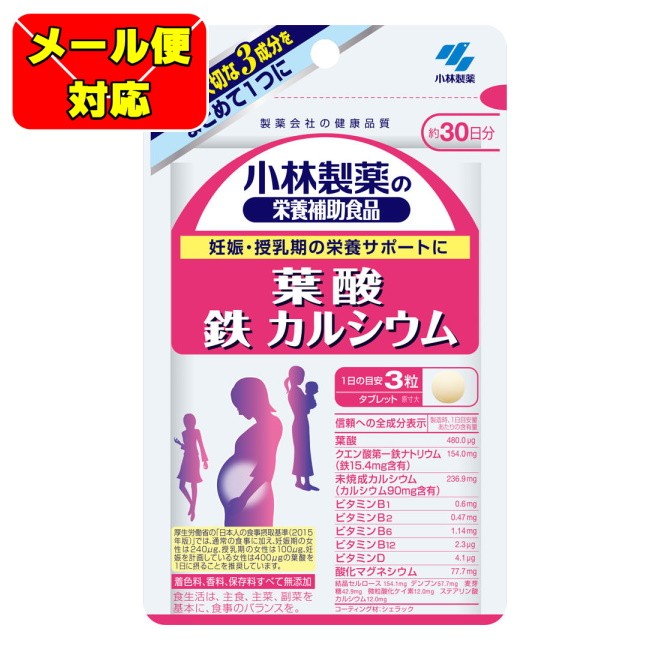 デンプン、麦芽糖/未焼成カルシウム、クエン酸第一鉄ナトリウム、結晶セルロース、酸化マグネシウム、微粒酸化ケイ素、ステアリン酸カルシウム、シェラック、ビタミンB6、ビタミンB1、葉酸、ビタミンB2、ビタミンD、ビタミンB12