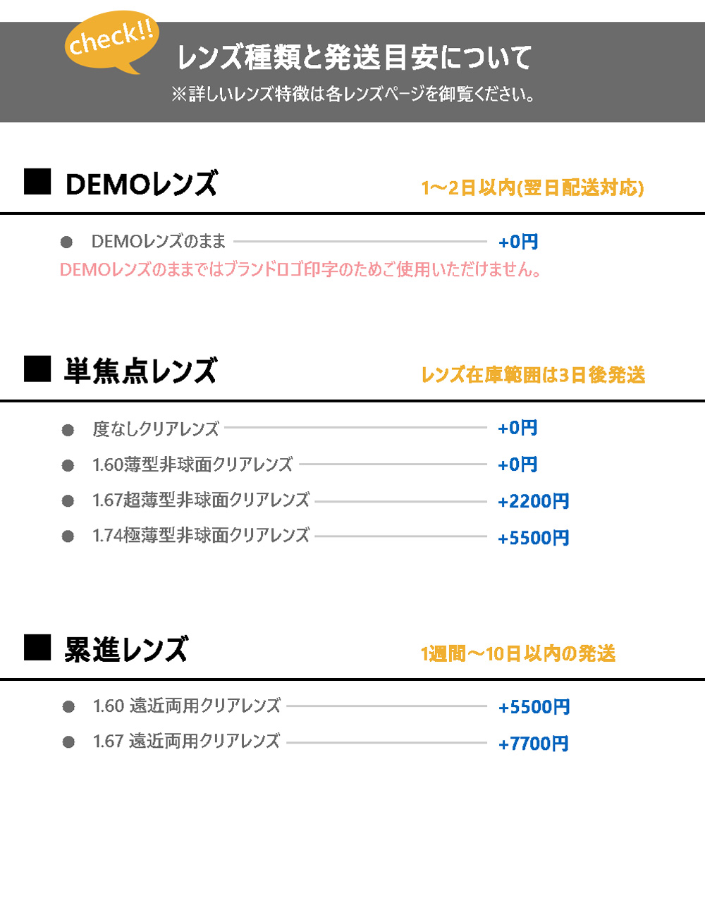 ※レンズを交換する場合は翌日配達には対応できませんのでご了承ください。フレームのみの場合は1〜2日以内、レンズ在庫範囲は3日後発送となりますのでご了承ください。(店舗休業日を除く)