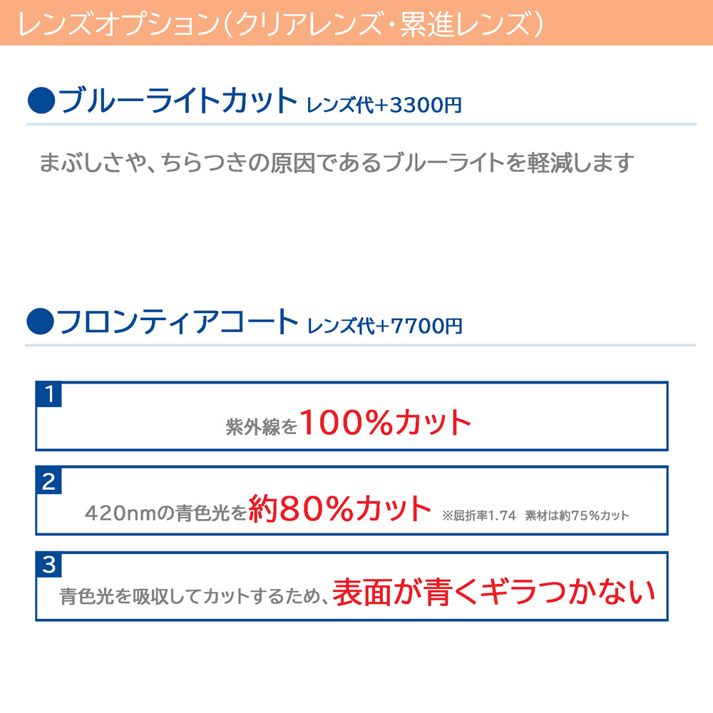 ※度付きレンズご希望の場合、度数範囲に制限があります。度数によっては追加料金が発生しますので、ご不明な点はお気軽にお問い合わせください。