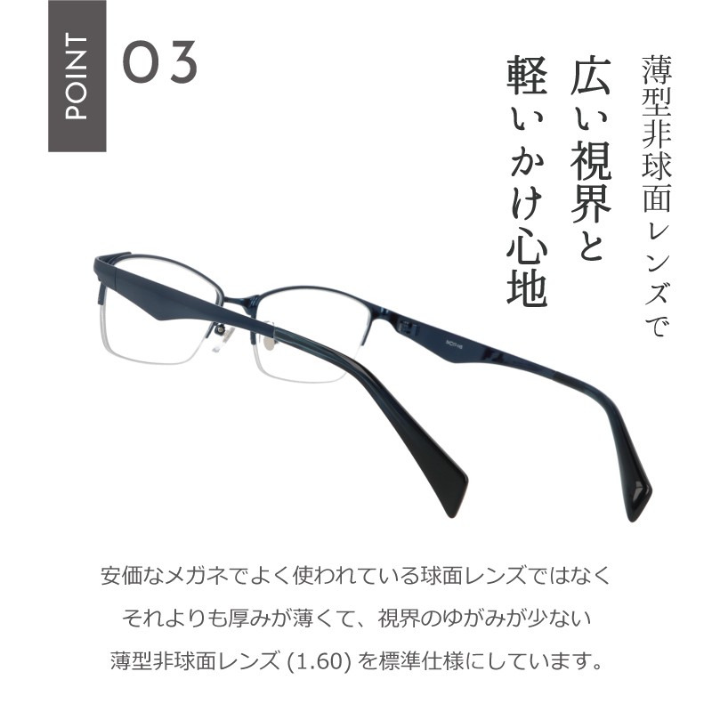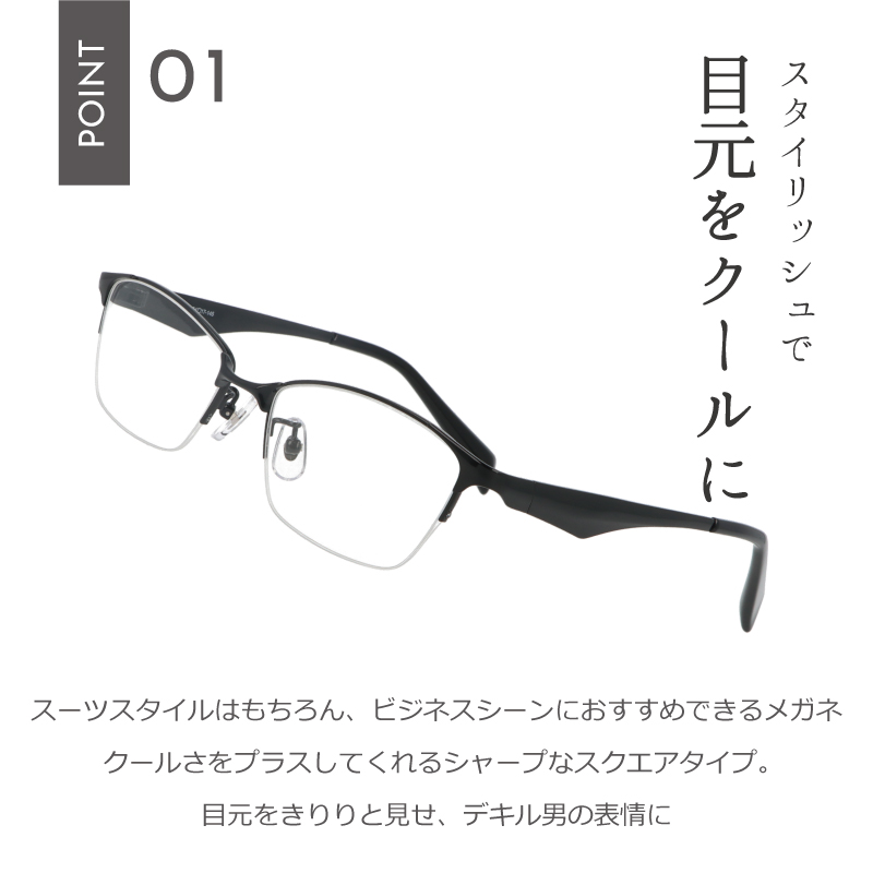 シンプルで洗練されたデザインがビジネスシーンにぴったりの、スクエアメガネ。スーツやビジネスカジュアルスタイルにもよくマッチします。知的で堅実な印象を与え、目元をきりりと見せ、デキル男の表情に。ビジネスの場での自信をさらに高めます。