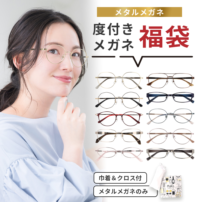 メガネ 福袋 眼鏡 度付き レディース メンズ メタルフレーム おしゃれ 度付きレンズ メガネ拭き 巾着袋 セット 近視 遠視 乱視 めがね メタル