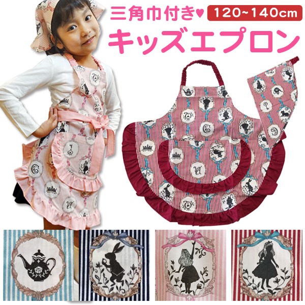 エプロン 子供 こども おしゃれ アリス 三角巾 セット キッズ 120cm 130cm 140cm 女の子 フリル リボン 可愛い