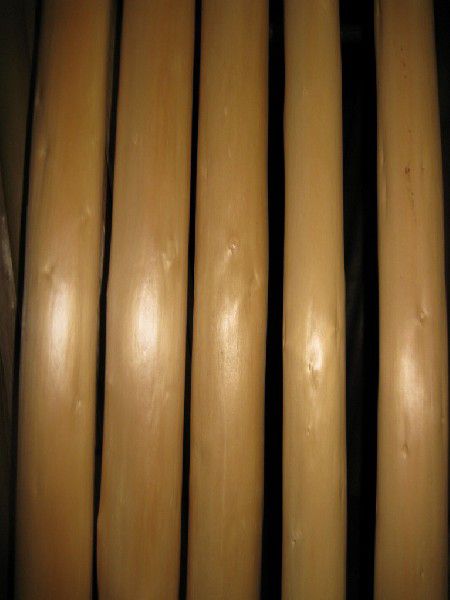 ほとんどの丸太材には背割れと呼ばれる切込みがあります。これは、大事な部分が割れないようにするのと、収縮に対応出来るようにするためです。