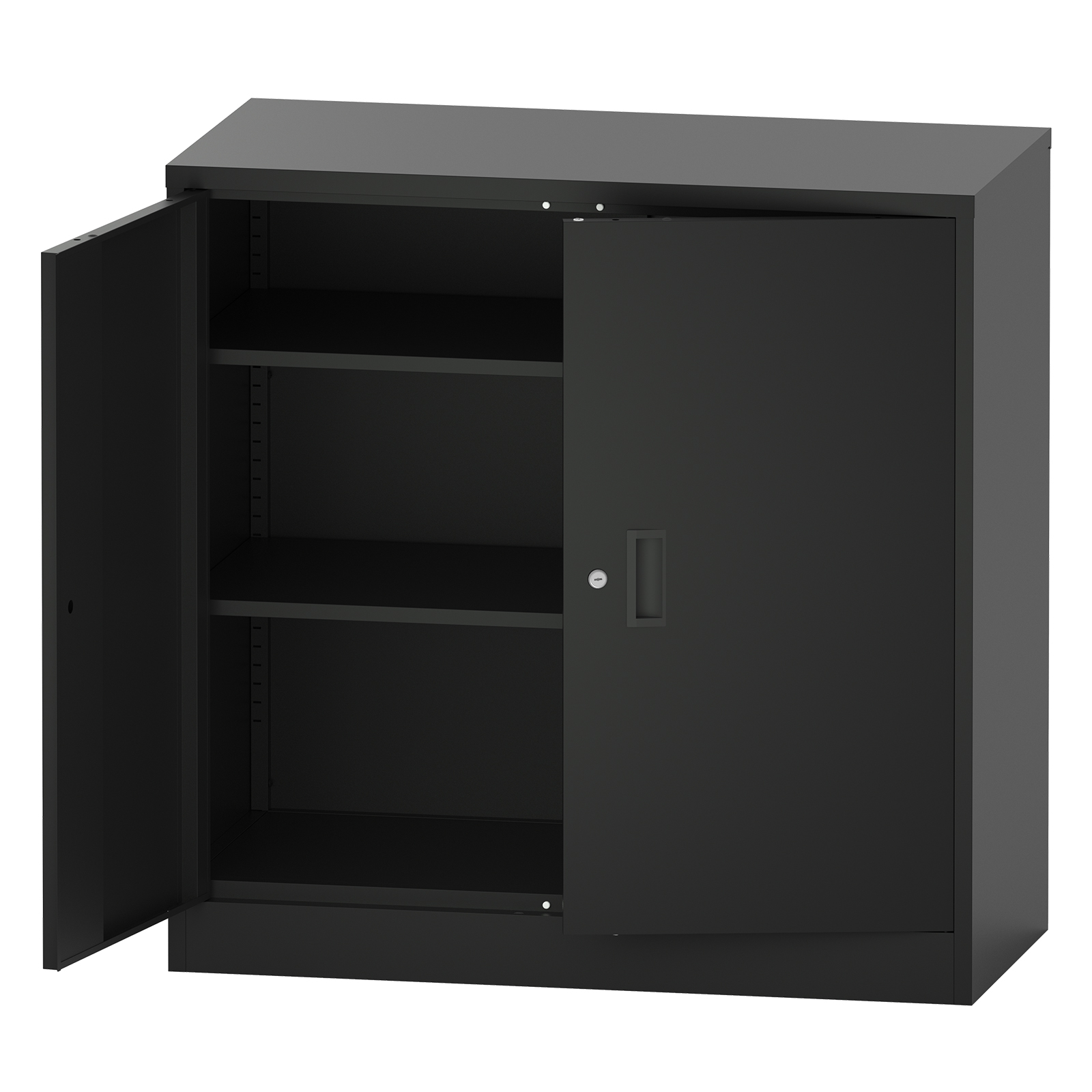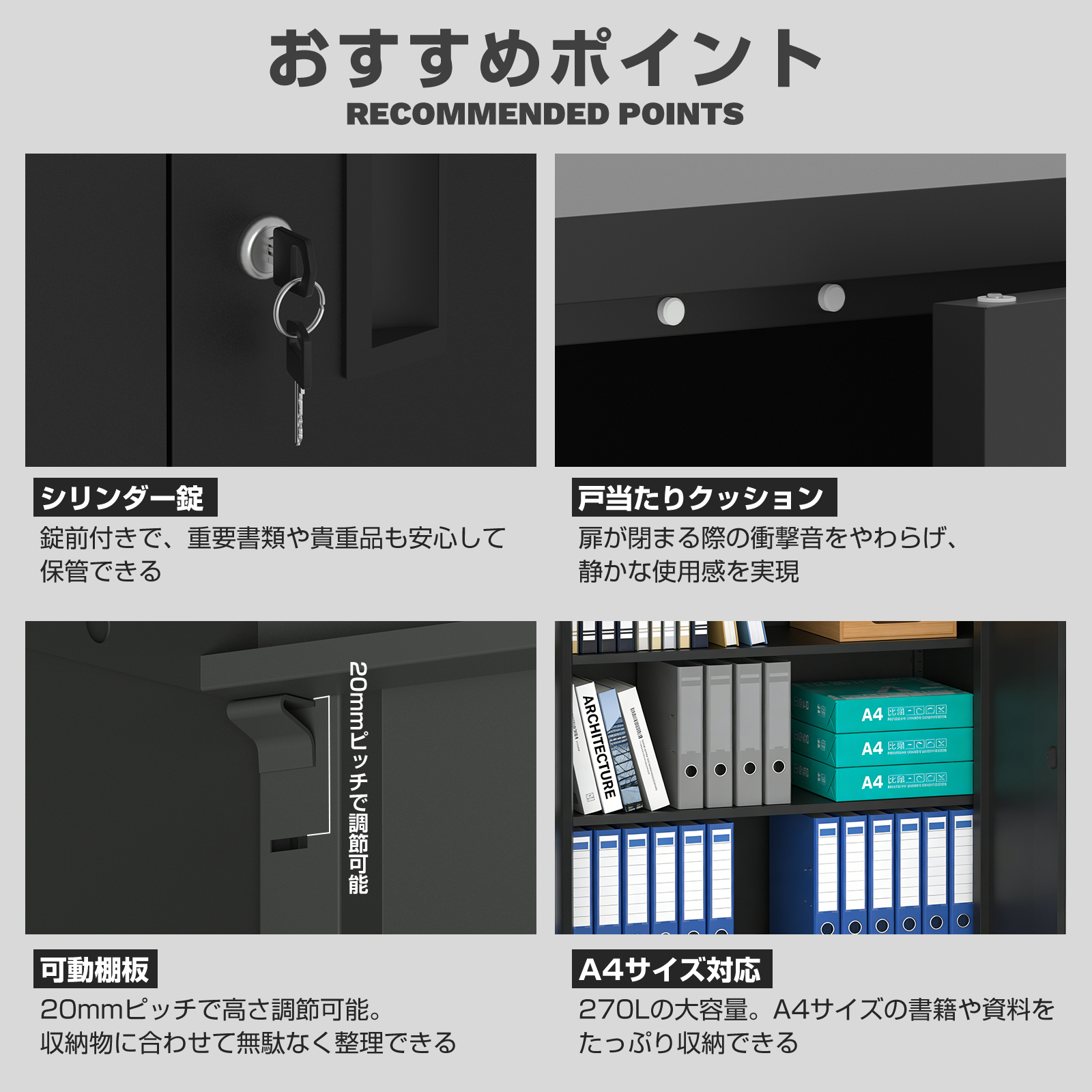 ・この収納庫は、耐久性に優れたスチール製で、長期間にわたって安心してご使用いただけます。シリンダー錠が付いているため、重要書類や貴重品を安全に保管することが可能です。また、戸当たりクッションが扉の閉まる際の衝撃音を軽減し、静かな使用感を提供します。