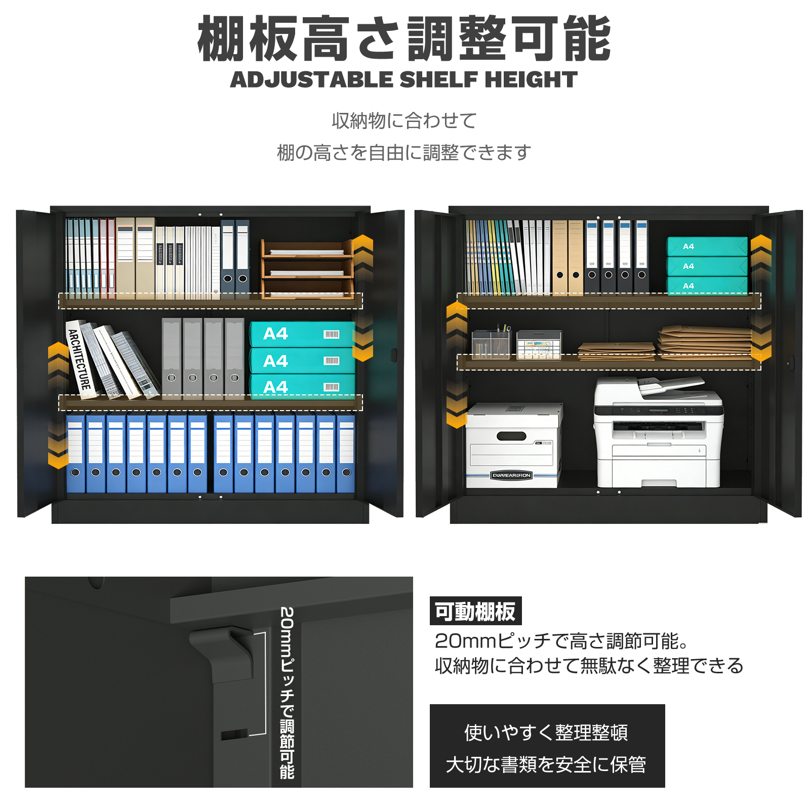 ・内部には可動棚があり、20mmピッチで高さを調整できるため、収納物に合わせて効率的に整理整頓が可能です。A4サイズの書籍や資料もたっぷり収納できる270Lの大容量を誇ります。