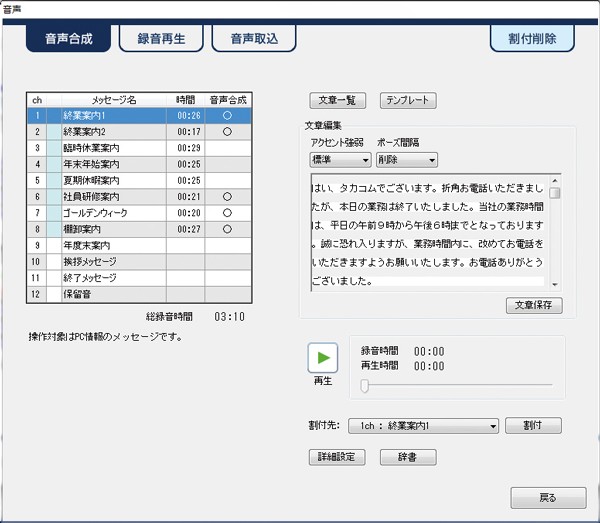 ・パソコン操作でメッセージ作成できるので、アナウンサーの 手配などメッセージ作成業務の負荷を軽減できます。