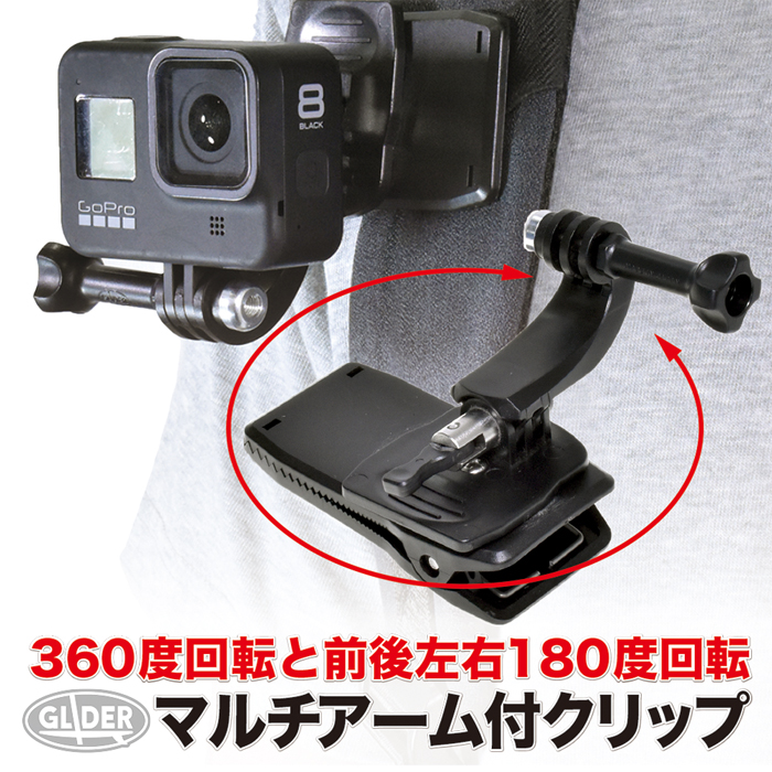 クリップマウント マルチアーム付き 360度回転 リュック肩ベルト用 アクションカメラ DJI/Insta360/GoPro用 角度調整 ハンズフリー