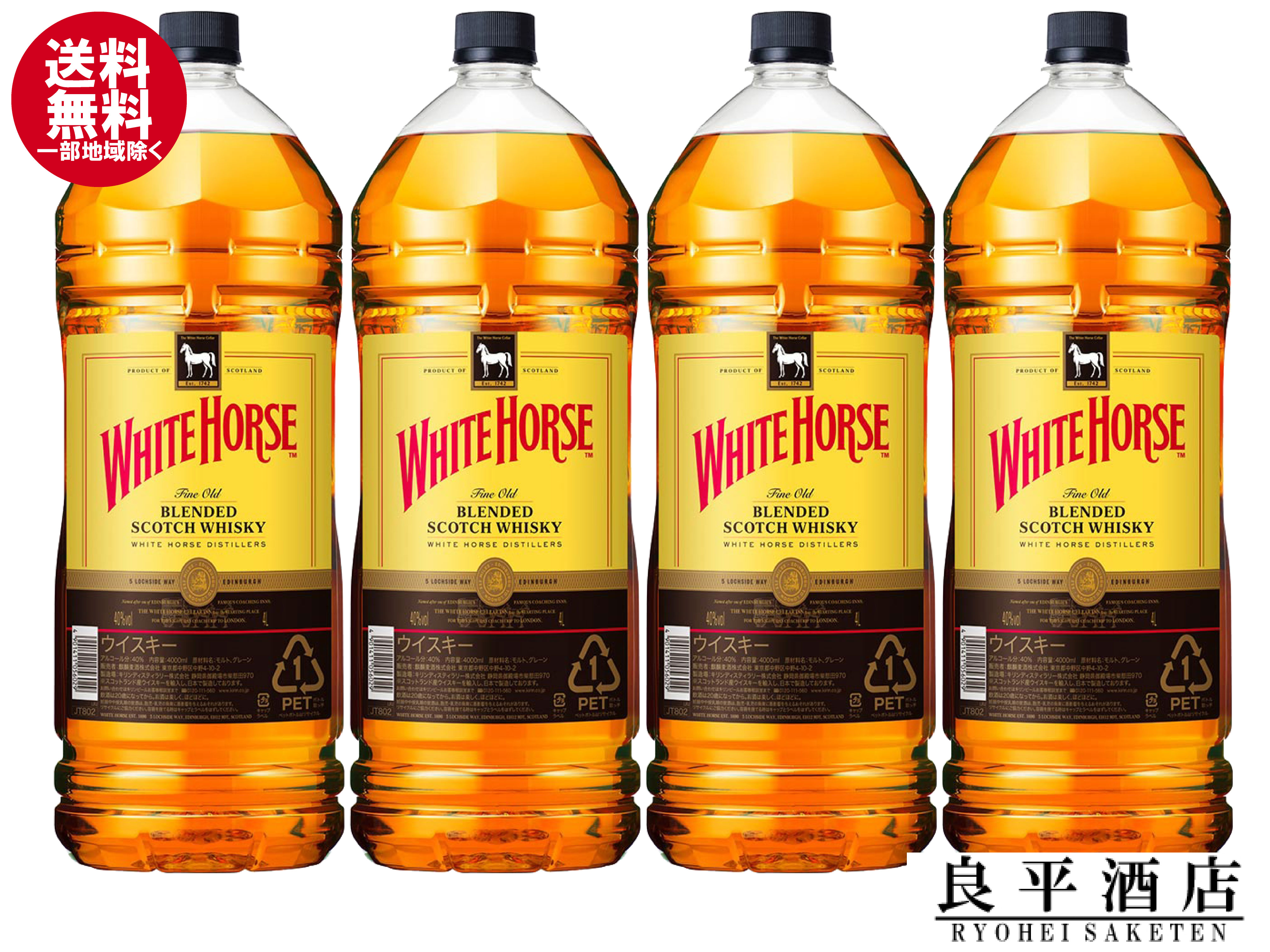 送料無料 ウイスキー ホワイトホース 4L 4000ml 4本 40度 業務用 ファインオールド 大容量 ケース ペット