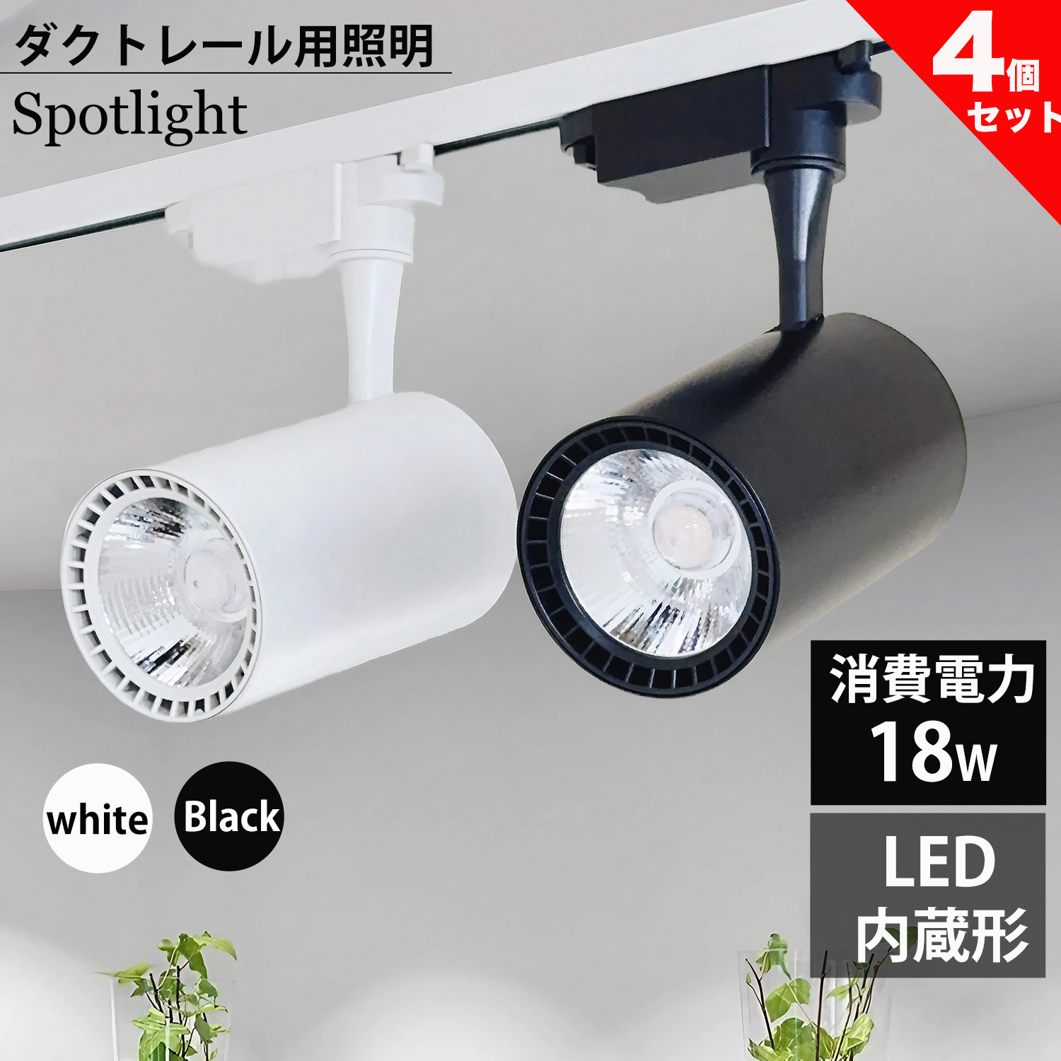 ダクトレール用 スポットライト LED内蔵型 ライティングレール LEDスポットライト 18W 電球色 昼白色 200W相当 ライティングレール用 レールライト 4個セット