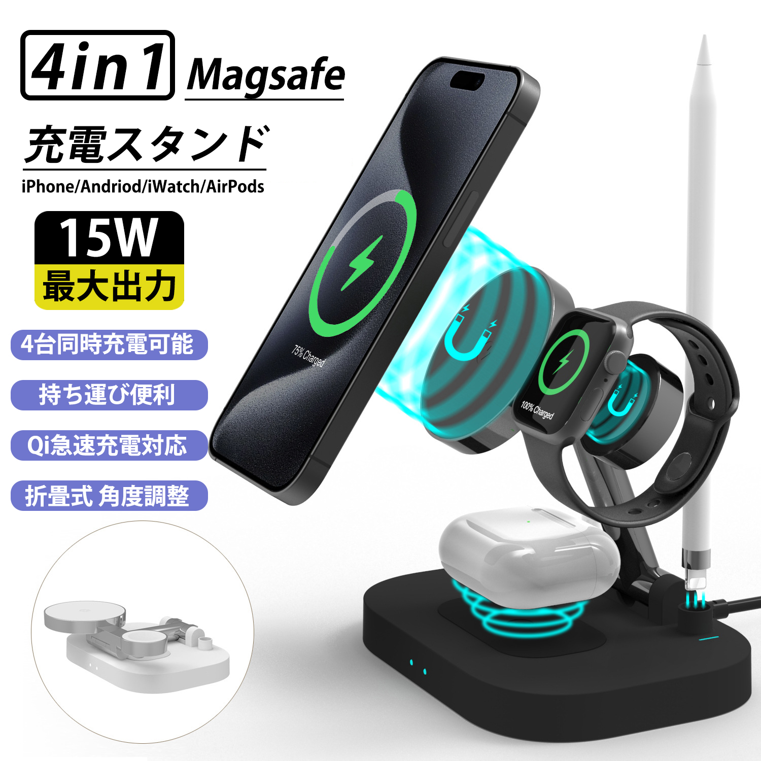 ワイヤレス充電器 4in1 iphone 15w ワイヤレス 充電器 スタンド iPhone Android アンドロイド 充電スタンド スマホ Qi 急速充電 4台同時充電可能