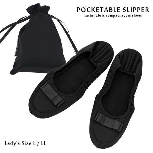 サテン リボン 携帯スリッパ レディース 折りたたみ フォーマル 収納ポーチ付き コンパクト 学校 行事 入学式 卒業式 参観日 面接 室内履き ブラック
