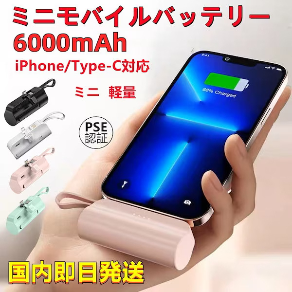 モバイルバッテリー 6000mAh ミニ 軽量 持ち運び便利 USB Type-C iphone / Android対応 急速充電 スマホ充電器 チャージ
