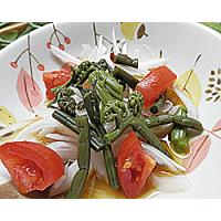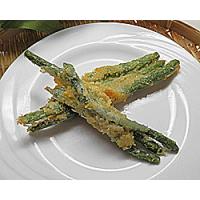 カットしたわらびを天ぷらに揚げでその上に温めたたて(本品だし汁)を