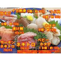 海鮮 お刺身 お造りセット(6〜8人前用が目安) 下記(1)-(8)の中から 5品詰合せ となります 商品写真の全てが届くわけではございません。 また、商品をご指定頂くことは一切出来ません (1)甘エビ 9匹(150g前後)ロシア産(2)ほたて貝 18個(120g前後)むつ湾産 一口サイズのベビーほたて(3)漬けマグロ (60g×3袋)しょう油漬け キハダマグロ(日本産)(4)ネギトロ(70g×3袋)キハダマグロ・メバチマグロ(日本産)(5)いか刺身(60g×3柵)するめいか(北海道産)(6)つぶ貝 9個(180g前後)カナダ産(7)サーモンネギトロ(70g×3袋)トラウトサーモン(チリ産 養殖)(8)ホタテ貝柱 9個(180g前後)北海道産 賞味期限:冷凍2週間、冷蔵1日間 切り身を入れたり海老の殻とりや盛付け等の 一手間は必要になります 大根のつま 小菊 大葉はついておりません 海鮮品のみです 配送温度帯 冷凍便 ご注意 北海道 沖縄県 他遠隔地 離島等は要別途料金 写真と実物とでは商品数や内容が異なる他 見た目や色合いなど異なります 上記の商品からの詰合せとなりますが、入荷状況や時節柄により予告なく他商品に代替させて頂き代替品は同等品となります