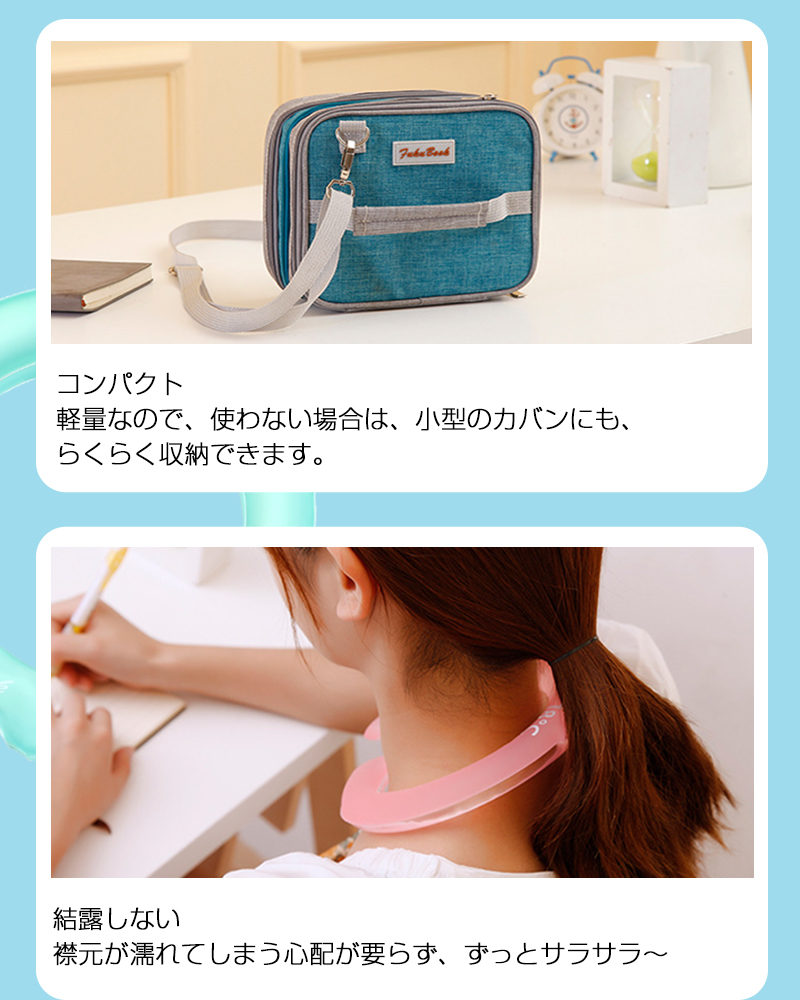 しっかり首元にフィットする形状は、両手を開けた状態で使えるのも嬉しいポイント。結露もしないのでずっとサラサラ〜!鞄に入れて持ち運んでも、鞄の中を濡らす心配もありません。