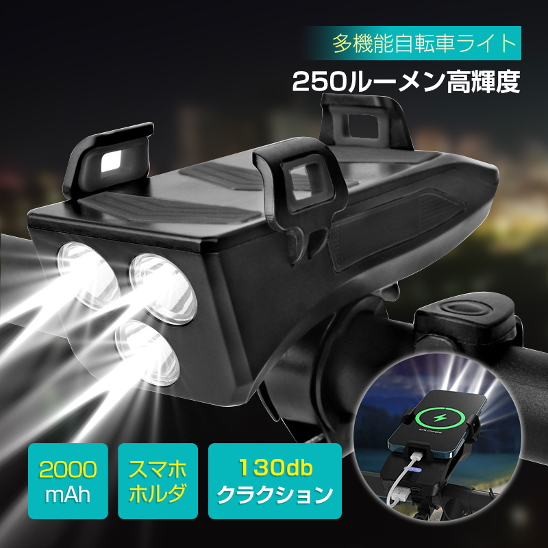 自転車ライト 4in1多機能 ヘッドライト USB充電 スマホホルダー 4〜6.7インチ携帯電話対応 2000mAhバッテリー USB-A出力 高輝度LED【PL保険加入済み製品・安心】