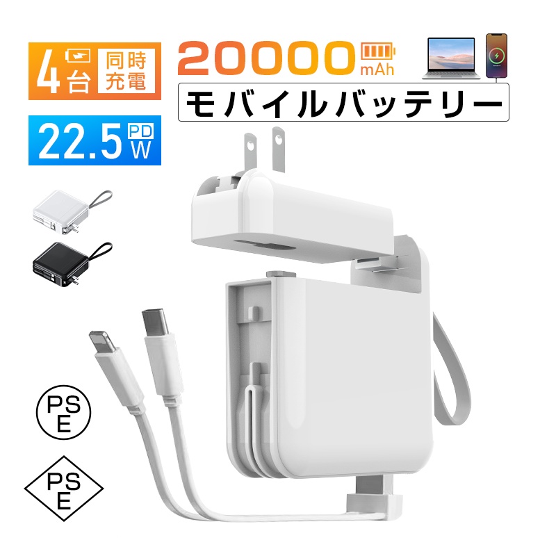 モバイルバッテリー 20000mAh大容量 ケーブル不要 防災電源 3in1 コンセント一体型 iPhone17充電 Type-C出力 ケーブル取り外し可能【PL保険加入済み製品・安心】