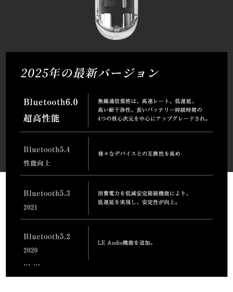 1、更に安定したBluetooth6.0通信規格で、遅延・途切れ改善。