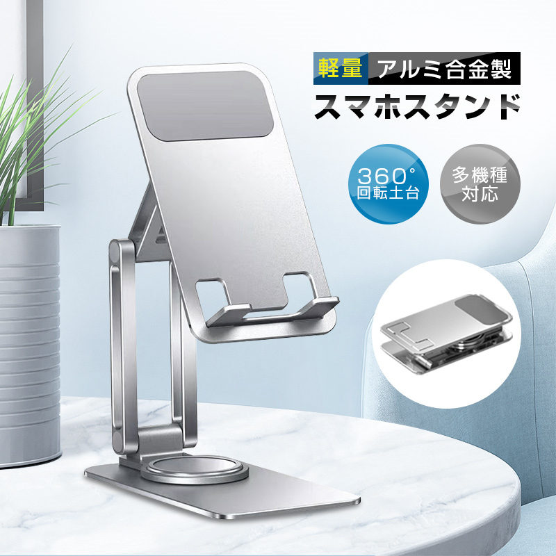 スマホスタンド 折りたたみ タブレットスタンド スマホホルダー 卓上 手帳型ケース対応 アルミ素材 スマホ置き 三段階調節 可動軸 高さ調整 シリコンパッド