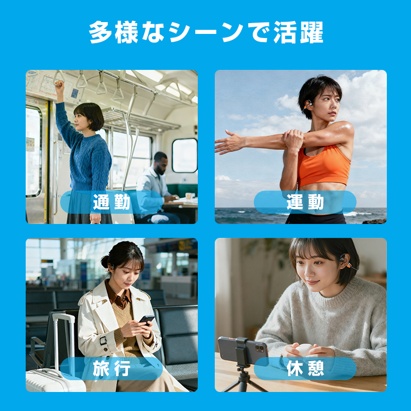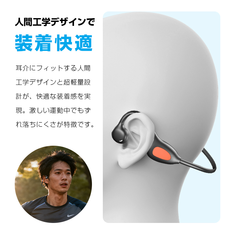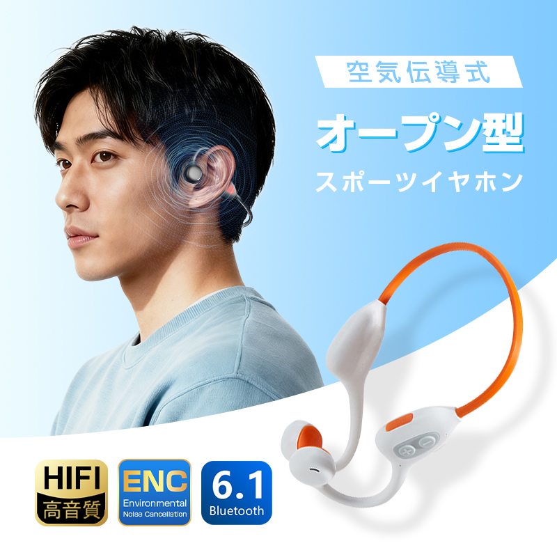 本製品は、従来のイヤホンとは一線を画す「空気伝導テクノロジー」を採用しています。耳穴を塞ぐ必要がなく、鼓膜直接の振動を利用する骨伝導とも異なり、独自の方式で音を伝達します。音楽を楽しみながら周囲の環境音も自然に聞き取れるため、ランニングやサイクリングなどのアウトドアでの使用時も安全性を確保します。
