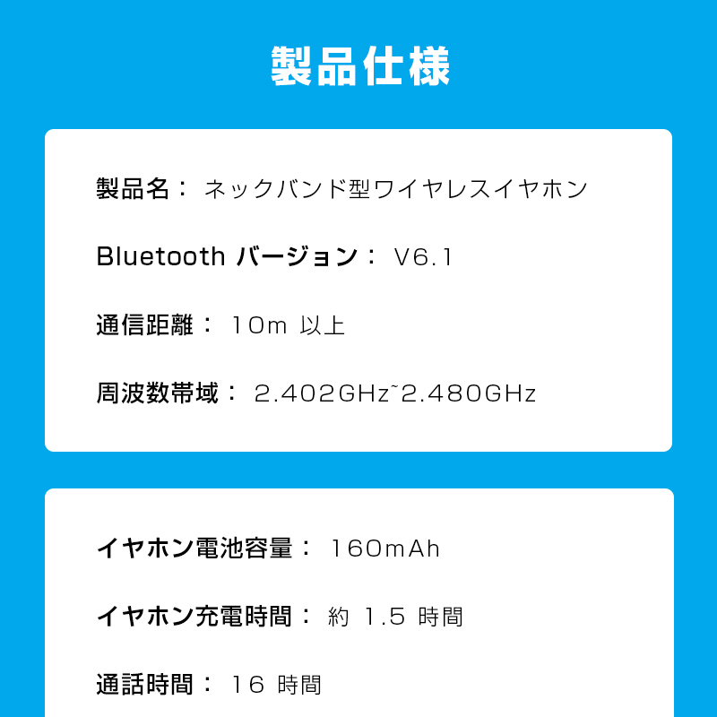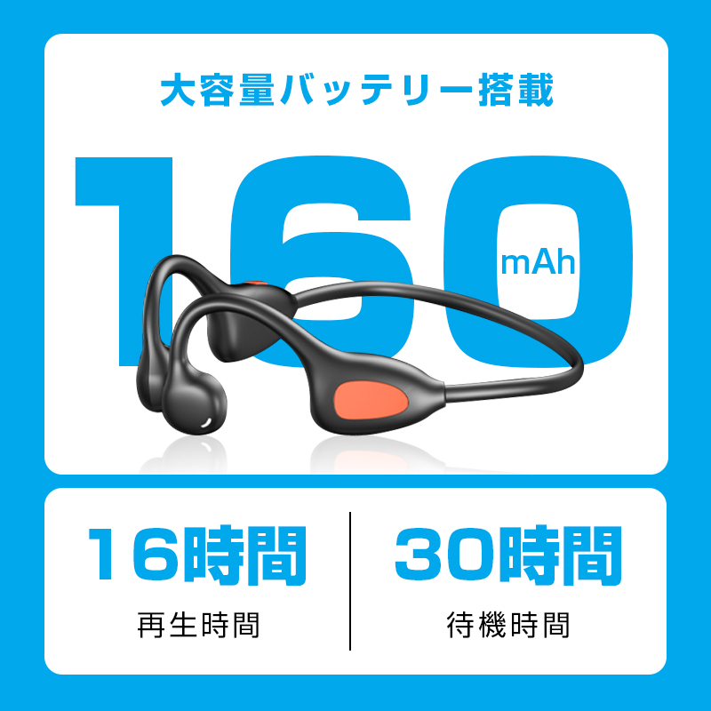 6.内蔵の160mAh大容量バッテリーにより、満充電後の連続再生・通話時間は最大16時間、待機時間は約30時間もあります。