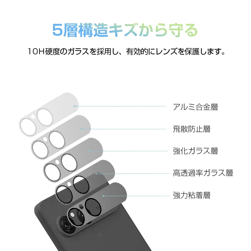 10H硬度の強化ガラス素材を採用することにより、外部からの衝撃を最大限にカットし、レンズ割れを徹底防御する耐衝撃の強化カメラ保護ガラスフィルムです。落下などによる衝撃を防ぎ、保護機能を更に強化させます。飛散防止処理をされて、万一がガラスフィルムが破損した際にも、破片を飛び散らないので、安心にご利用いただけます。