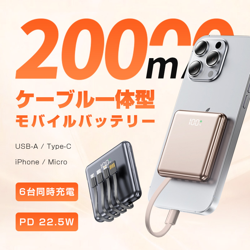 モバイルバッテリー 20000mAh大容量 PD22.5W急速充電 4本ケーブル内蔵 パワーバンク iPhone 17/16充電 小型 軽量 防災電源 PSE認証【PL保険加入済み・安心】