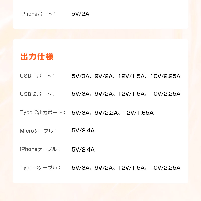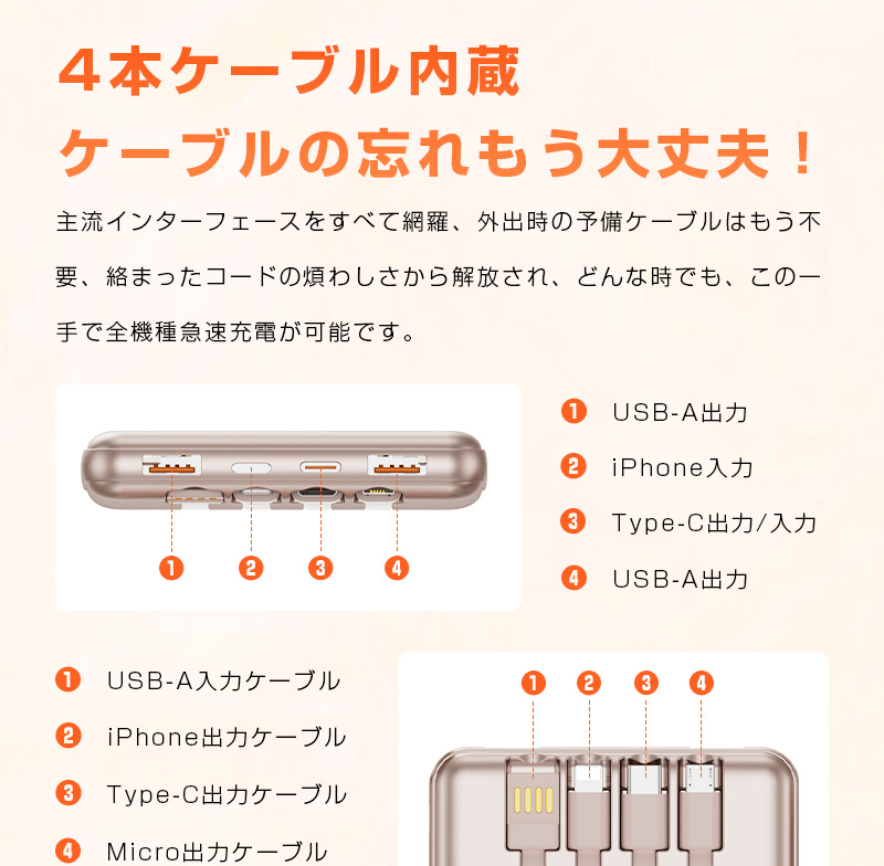 2. 本機にはType-C(22.5W出力)、Micro、iPhone、USB-Aの4本のケーブルが内蔵され、対象設備のポートを問わず、フルサポートします