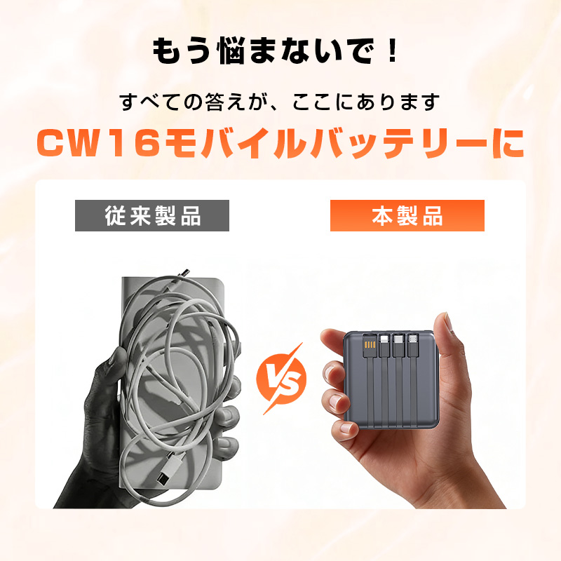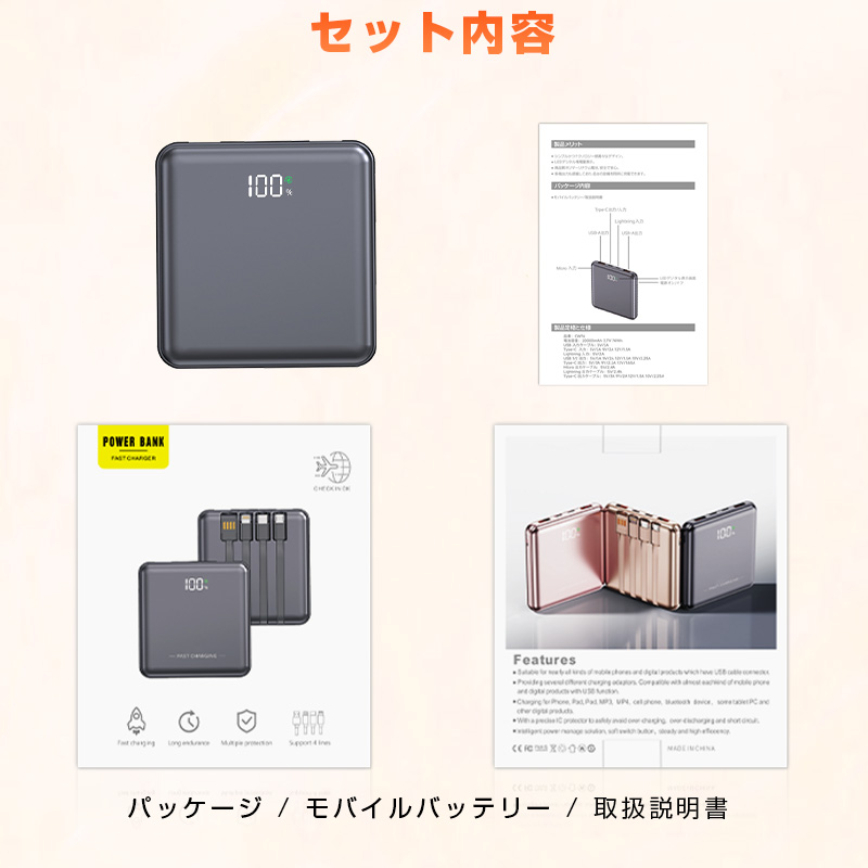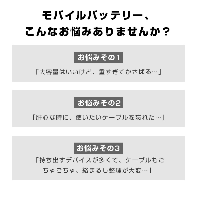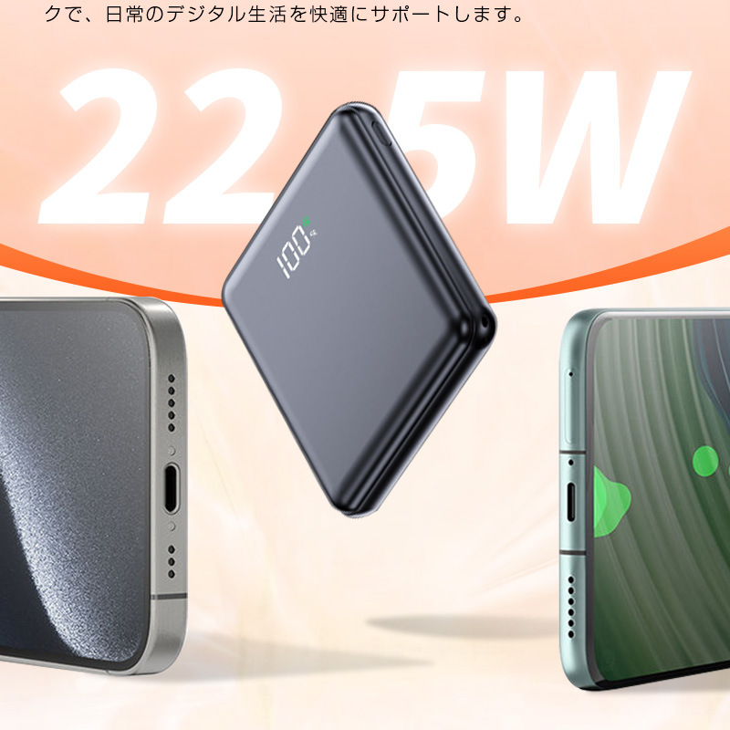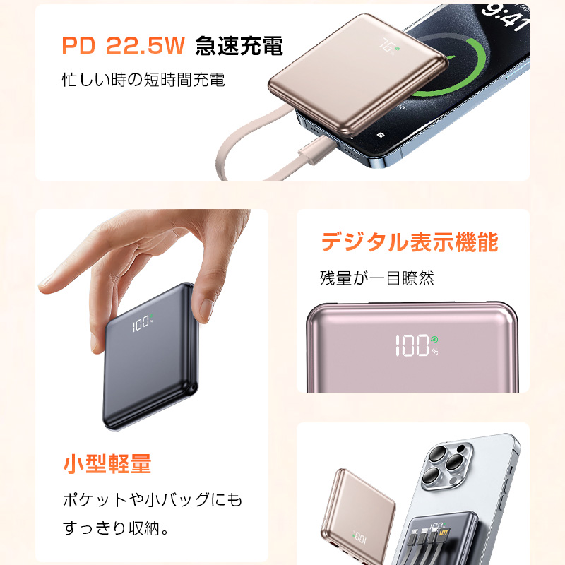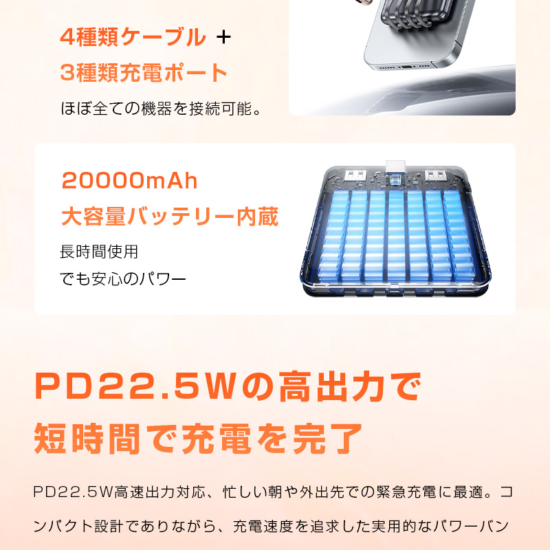 この「PD22.5W出力・4本ケーブル内蔵モバイルバッテリー」は、超高速充電、驚異的な利便性、卓越した携帯性、そして最高レベルの安全性という、ユーザーが求める全ての要素を一つの製品に凝縮しました。