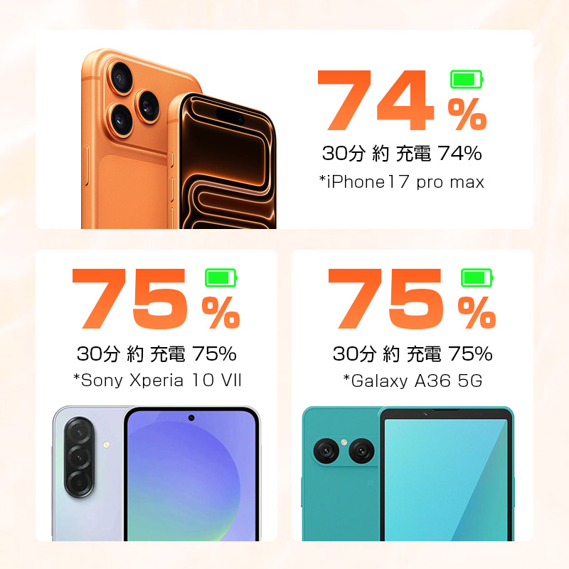 1. PD22.5Wの超高速充電に対応。iPhone 17 Proなら約30分で74%まで充電可能