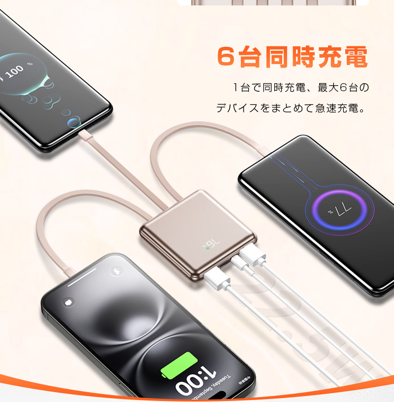 3. 内蔵の3本出力ケーブルに加え、3つの出力ポートを活用することで、最大6台のデバイスを同時に充電可能